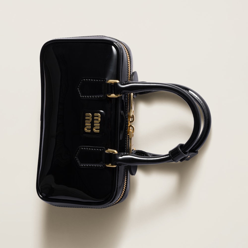 The top-handle silhouette of the Arcadie bag is enhanced by the shine of patent leather in this version, which combines vintage experimentation and Miu Miu’s glamorous essence.