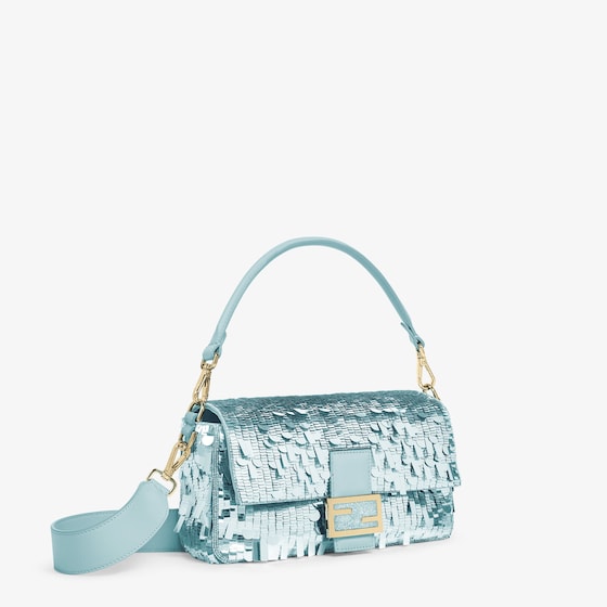 Hand-embroidered with light blue sequins of different shapes and sizes. Embellished with tone on tone calfskin details and decorated with an FF clasp.
