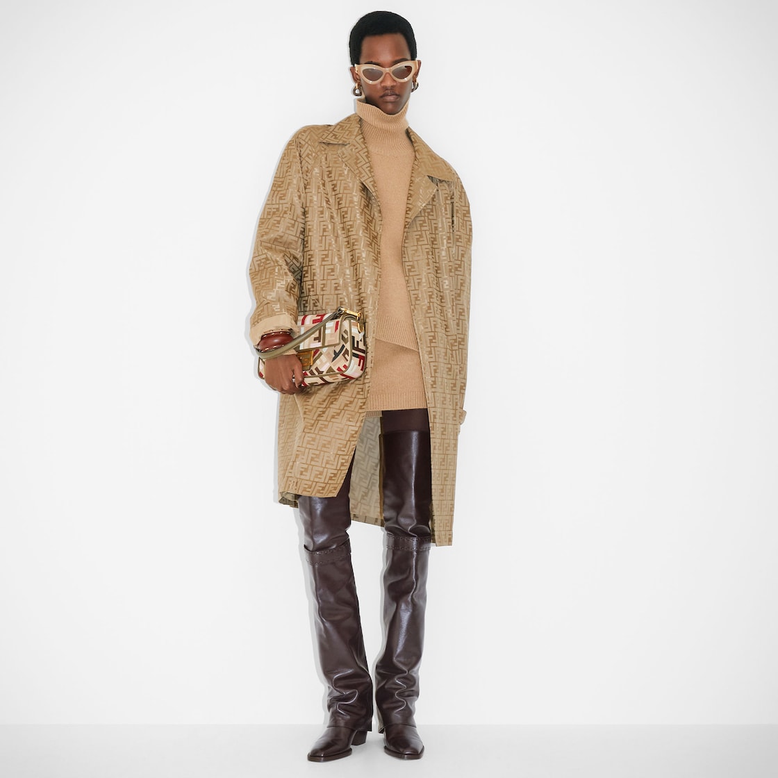 Made of beige canvas fabric with the iconic embossed FF motif embroidered in multicolor yarn. Trimmed in green calfskin and embellished with an FF clasp.