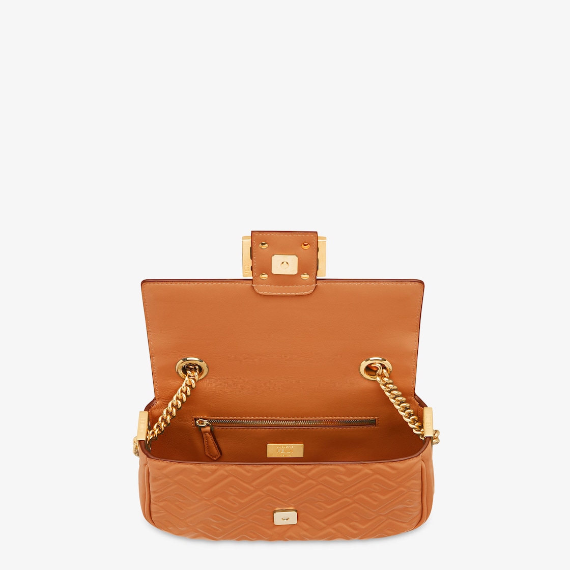Iconic medium Baguette bag with chain made of brown soft nappa leather with a three-dimensional texture FF motif. Decorated with an FF clasp.