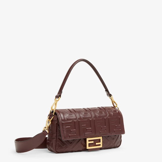 Iconic medium Baguette bag, part of the collection curated with designer Stefano Pilati, made of burgundy soft nappa leather with a three-dimensional texture embossed FF motif. Decorated with an FF clasp.