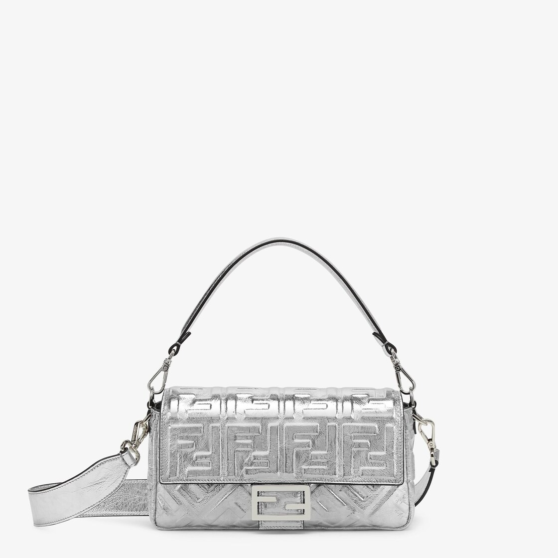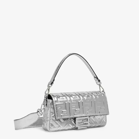 Iconic medium Baguette bag made of soft silver laminated nappa leather with a craquelé effect and 3D embossed FF motif. Decorated with an FF clasp.