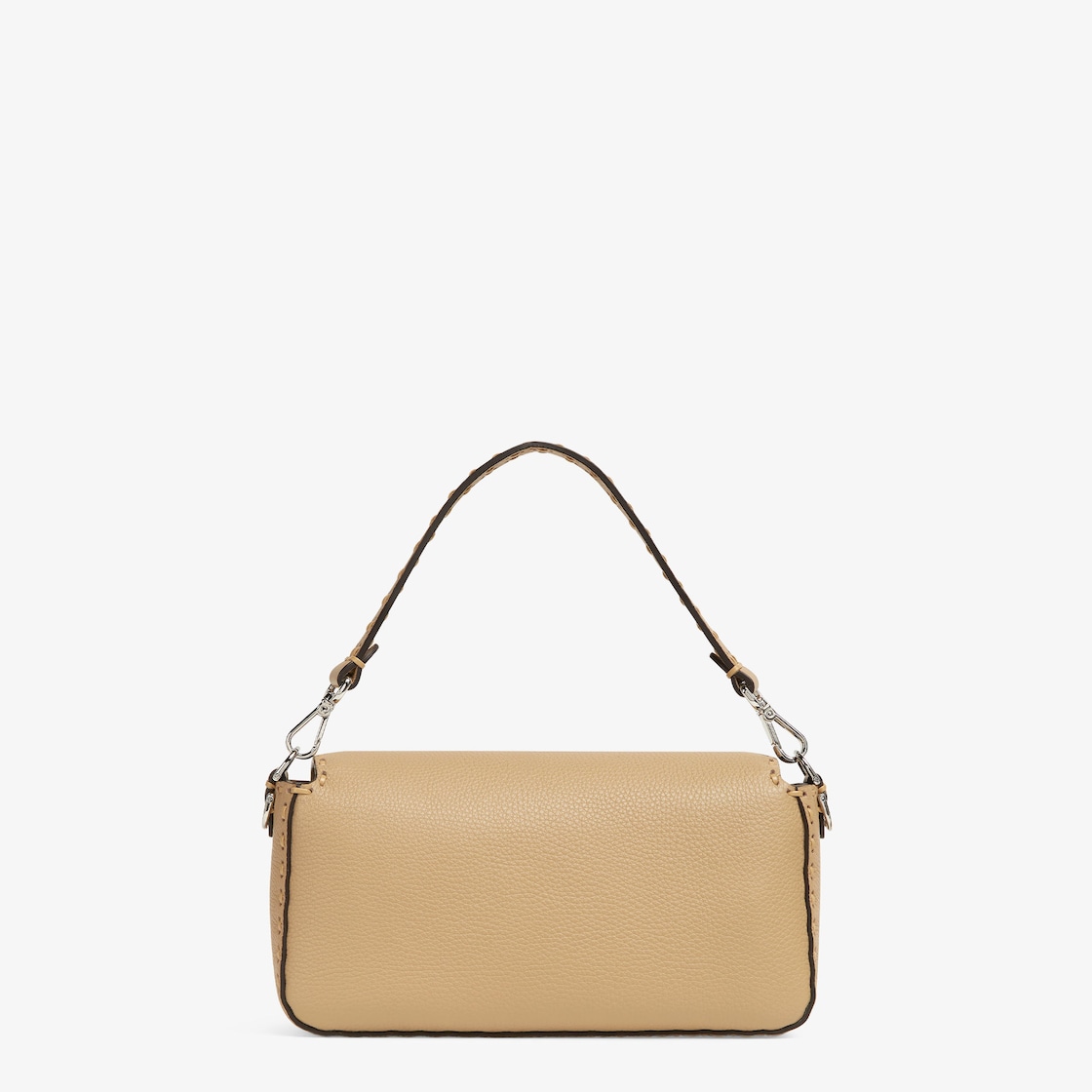 Iconic medium Baguette bag, made of sand-colour Cuoio Romano leather embellished by hand with matching-tone stitching. Decorated with an FF clasp.