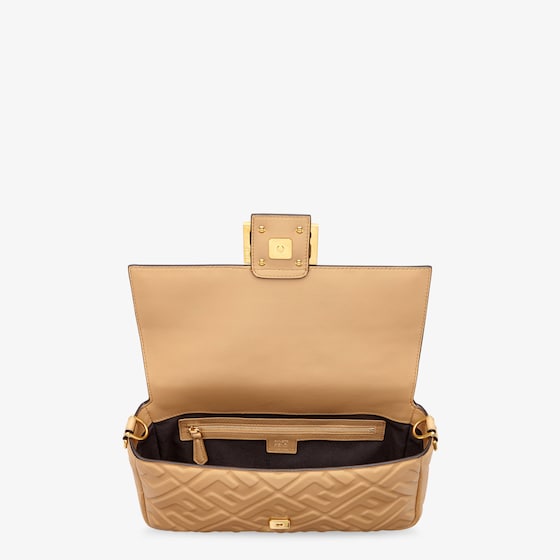 Iconic medium Baguette bag made of beige soft nappa leather with a three-dimensional textured embossed FF motif. Decorated with an FF clasp.