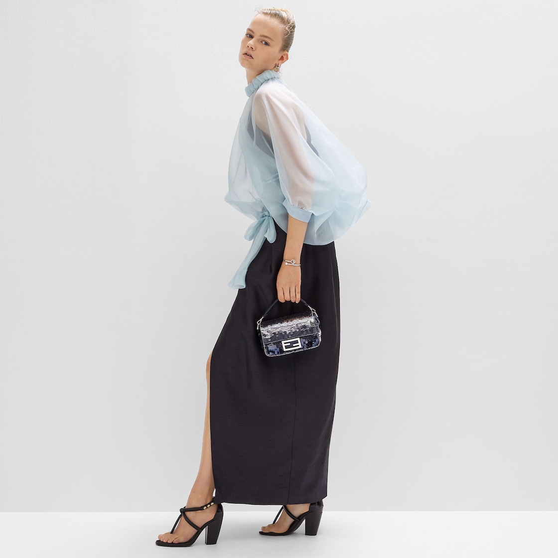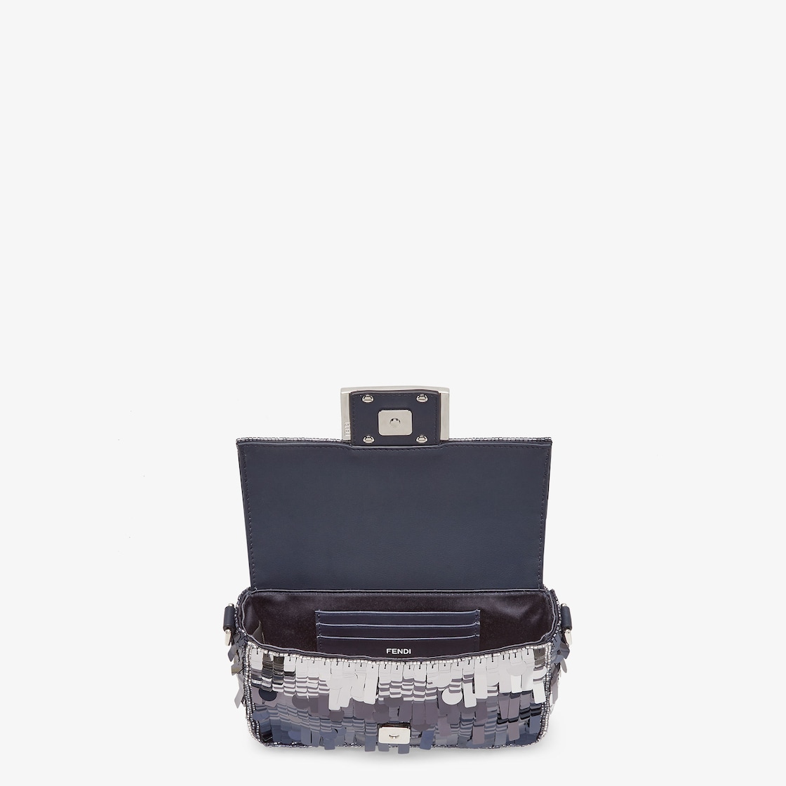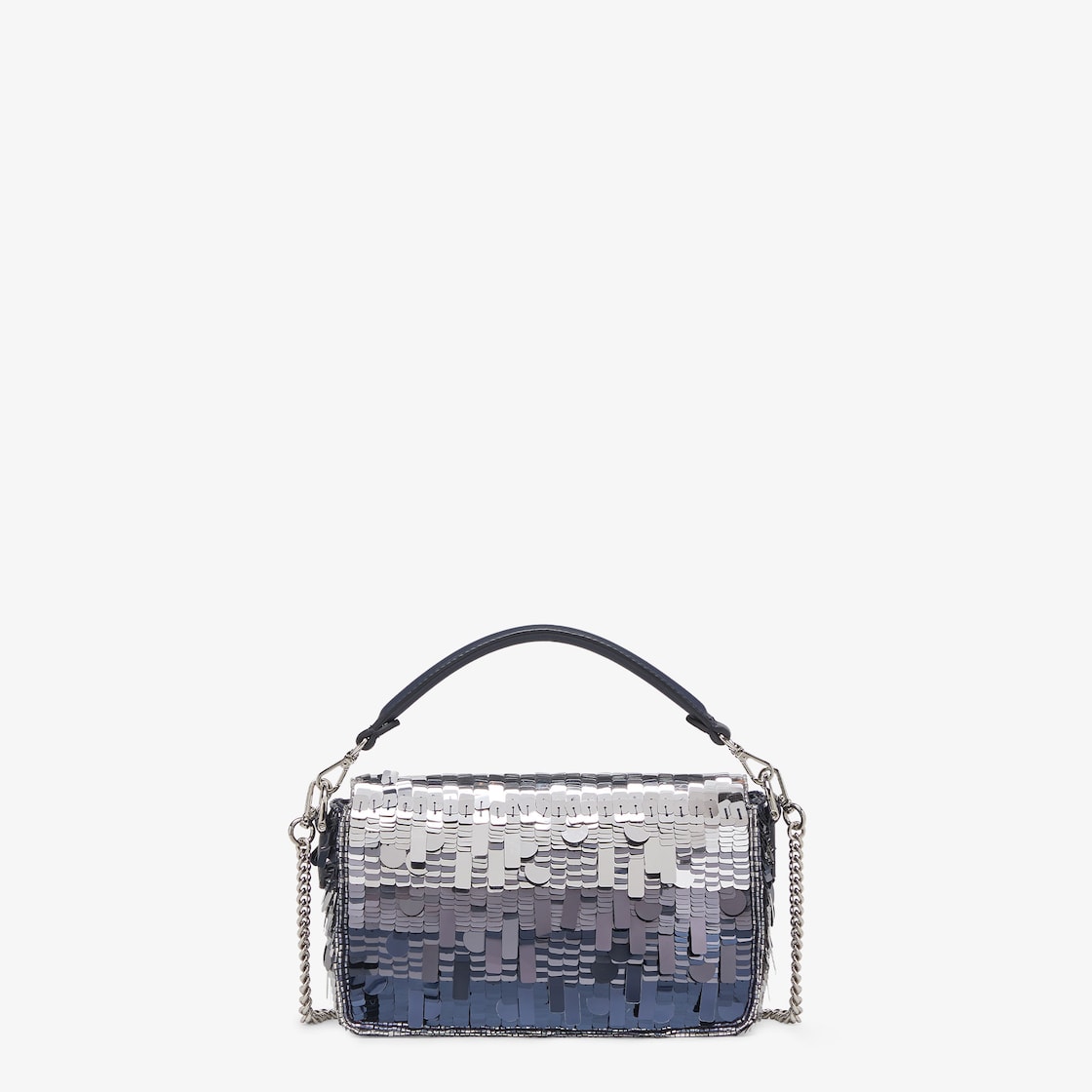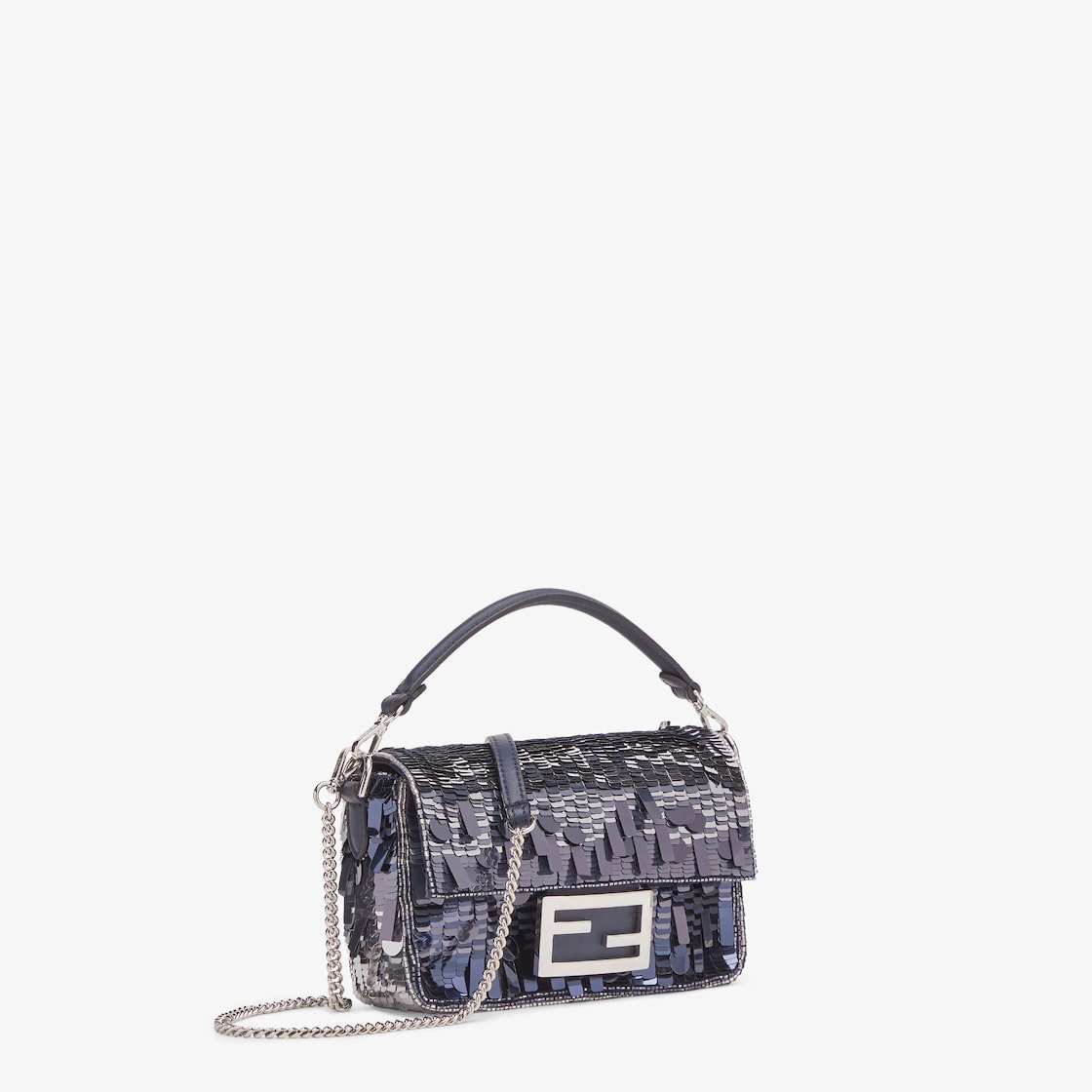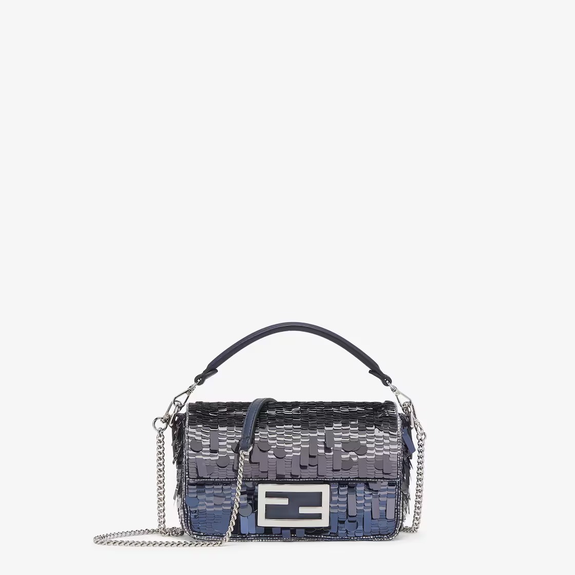 Iconic mini Baguette bag with all-over embroidery in metallic sequins of different shapes and sizes that create a gradient effect in shades of blue. Decorated with an FF clasp.