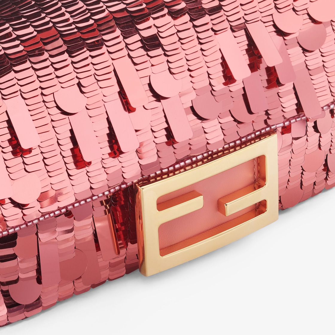 Iconic small Baguette bag hand-embroidered with pink sequins of different shapes and sizes. Trimmed in pink calfskin and embellished with an FF clasp.