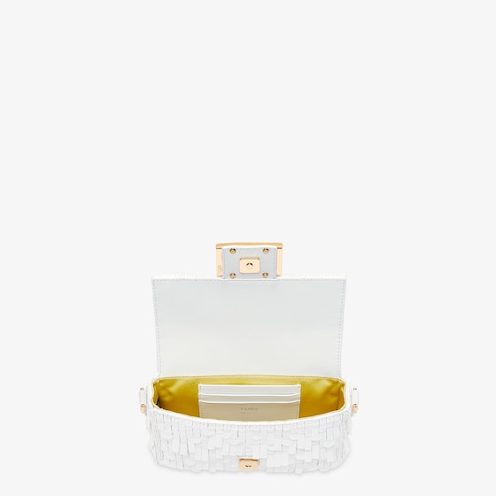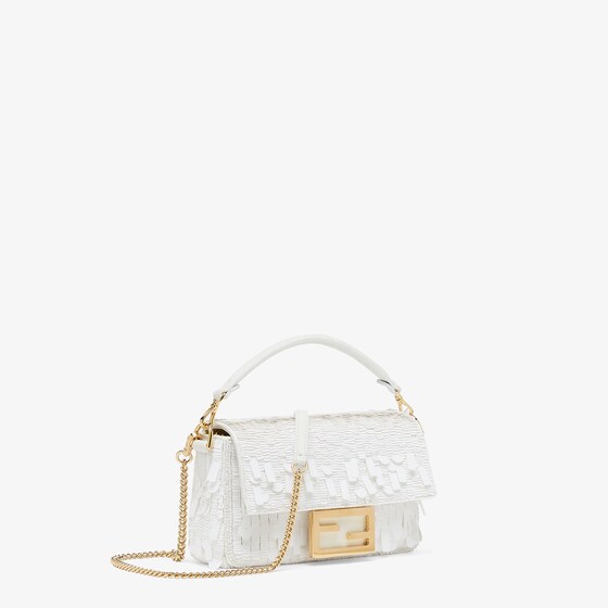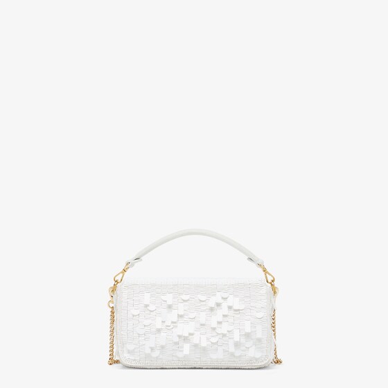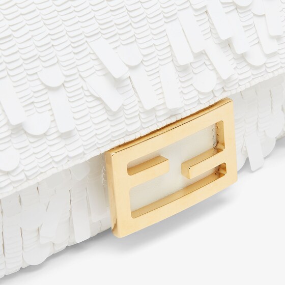 Iconic mini Baguette bag embroidered all-over with white metallic sequins in different shapes and sizes. Decorated with an FF clasp.