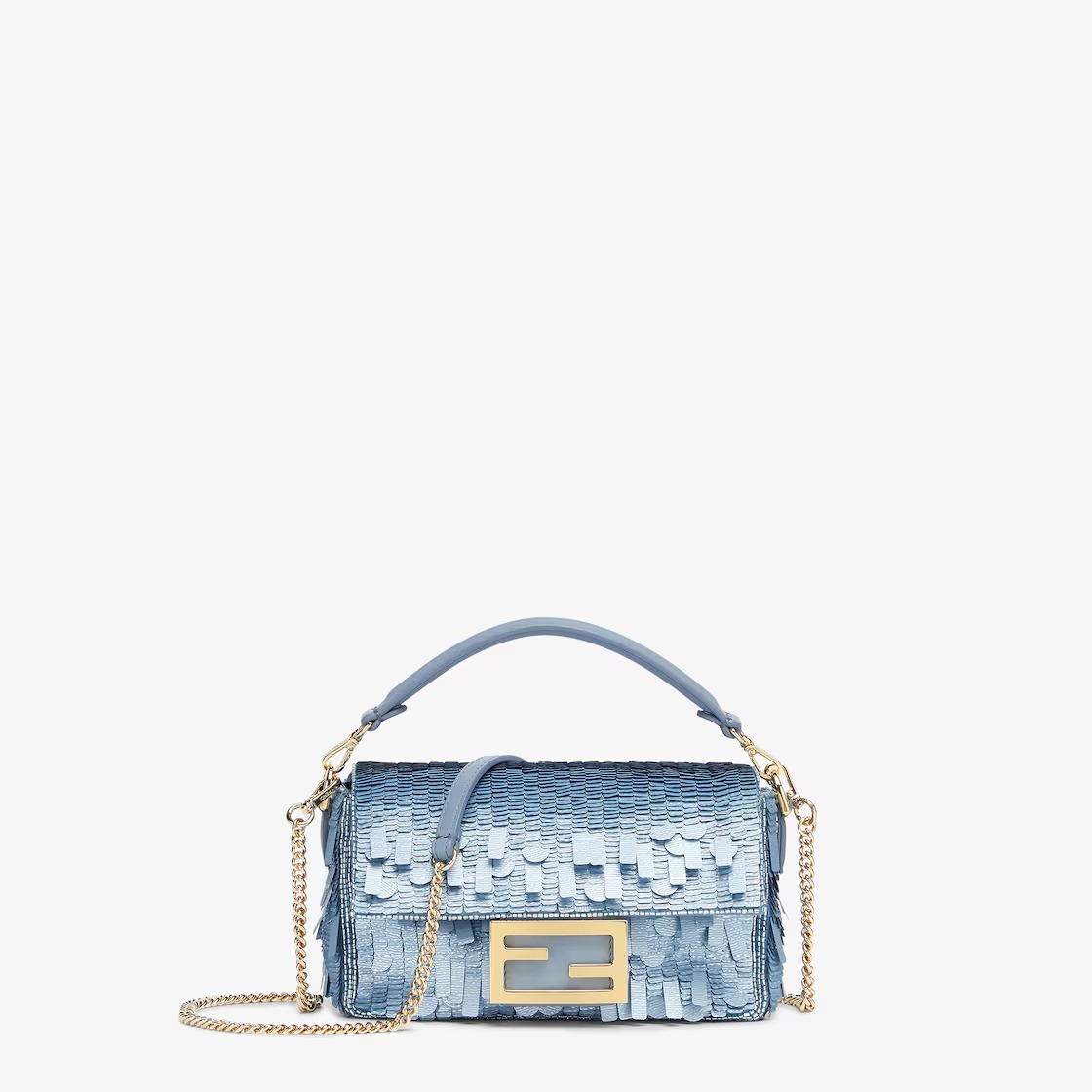 Iconic small Baguette bag, embroidered with light blue sequins of different shapes and sizes with a denim-effect finish. Trimmed in light blue calfskin and embellished with an FF clasp.