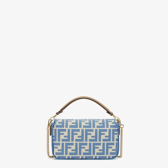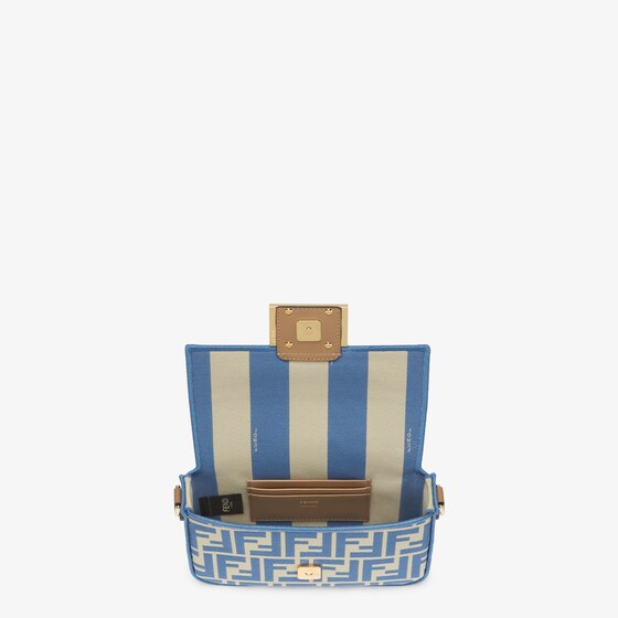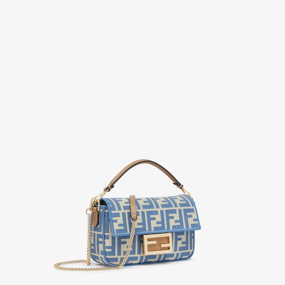 Iconic small Baguette bag made of jacquard fabric with the iconic FF motif in shades of light bue, embellished with light blue embroidered borders, beige leather details and embellished with an FF clasp.