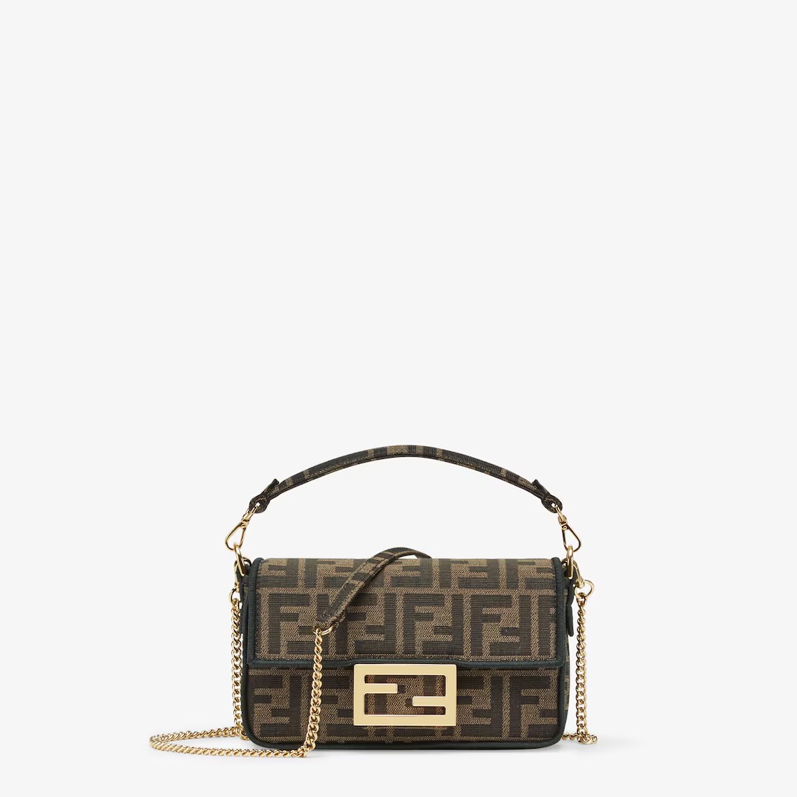 Small iconic Baguette bag made of jacquard fabric with the iconic FF motif in brown, decorated with an FF clasp and trimmed with black embroidery.