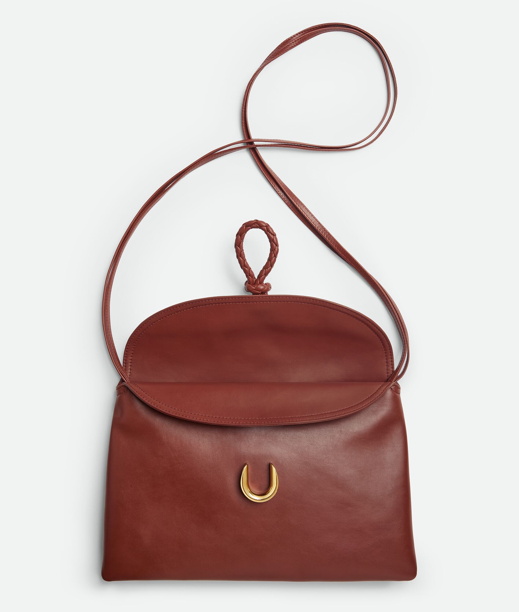Cross-body bag in smooth calfskin leather with double flap and fastening system consisting of metal elements and coaxial cord