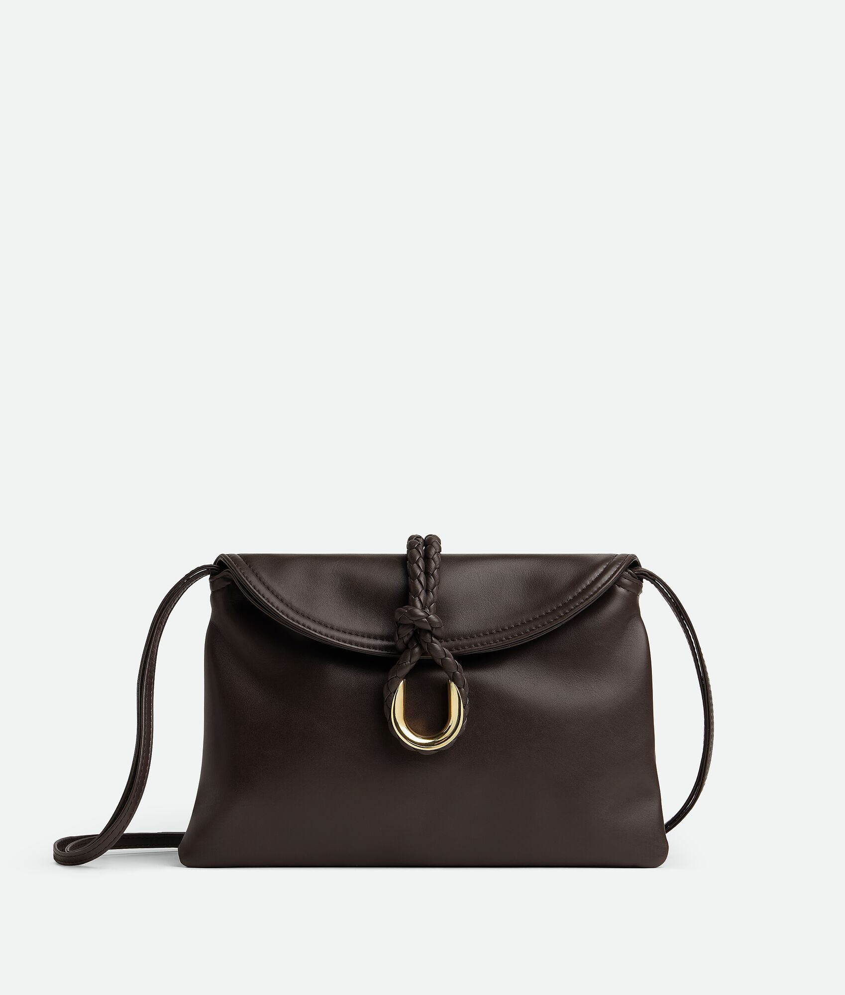 Small cross-body bag in smooth calfskin leather with double flap and fastening system consisting of metal elements and coaxial cord