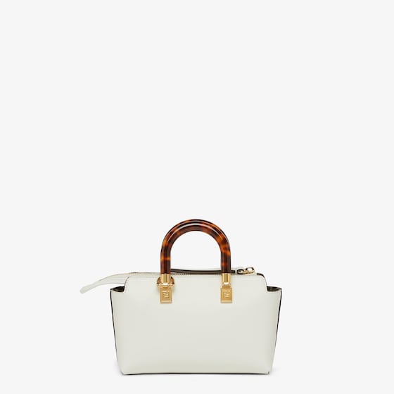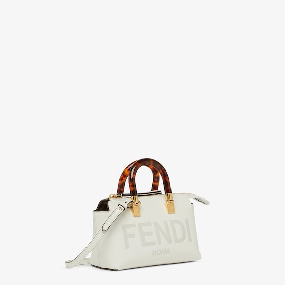Iconic mini By The Way Boston bag made of white leather with heat-stamped FENDI ROMA lettering and rigid tortoiseshell-effect plexiglass handles. Zipper closure.