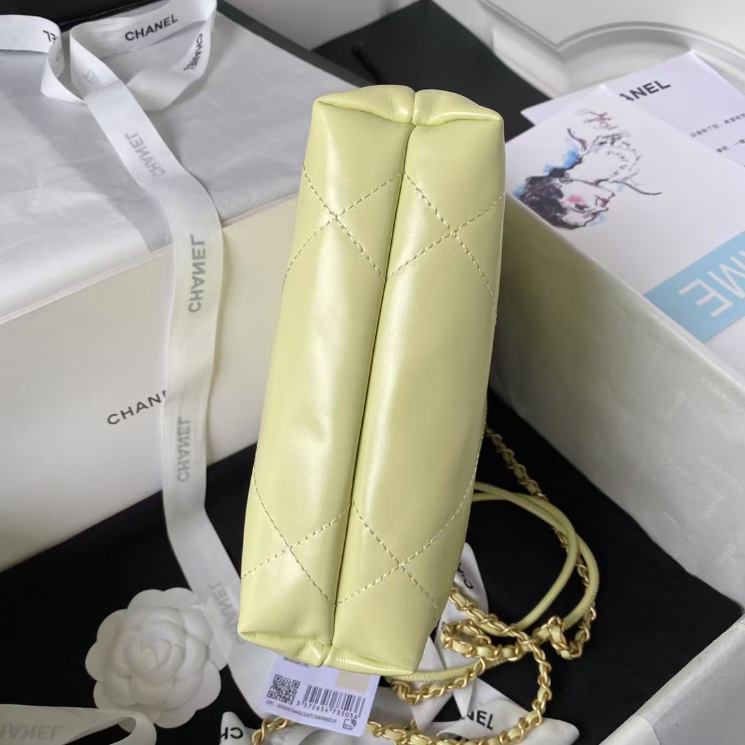 This mini 22hobo bag inyellow calfskin withgold tone hardware and has the signature diamond quilting, CHANEL on the front in gold metal, and longgold tone andyellow leather interwoven chain.