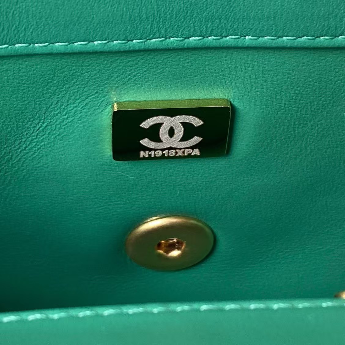 Interior lined with green leather with zippered pocket with Chanel zipper and open pocket below.