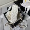This exquisite Chanel evening bag captivates with its elegant design and luxurious details. The pure black body, reminiscent of a starry night, is both simple and sophisticated. The intricate diamond pattern and iconic gold double-C logo exude understated luxury, while the unique handle adds a touch of charm and playfulness. The classic black and gold combination makes it a perfect accessory for evening events and formal attire.