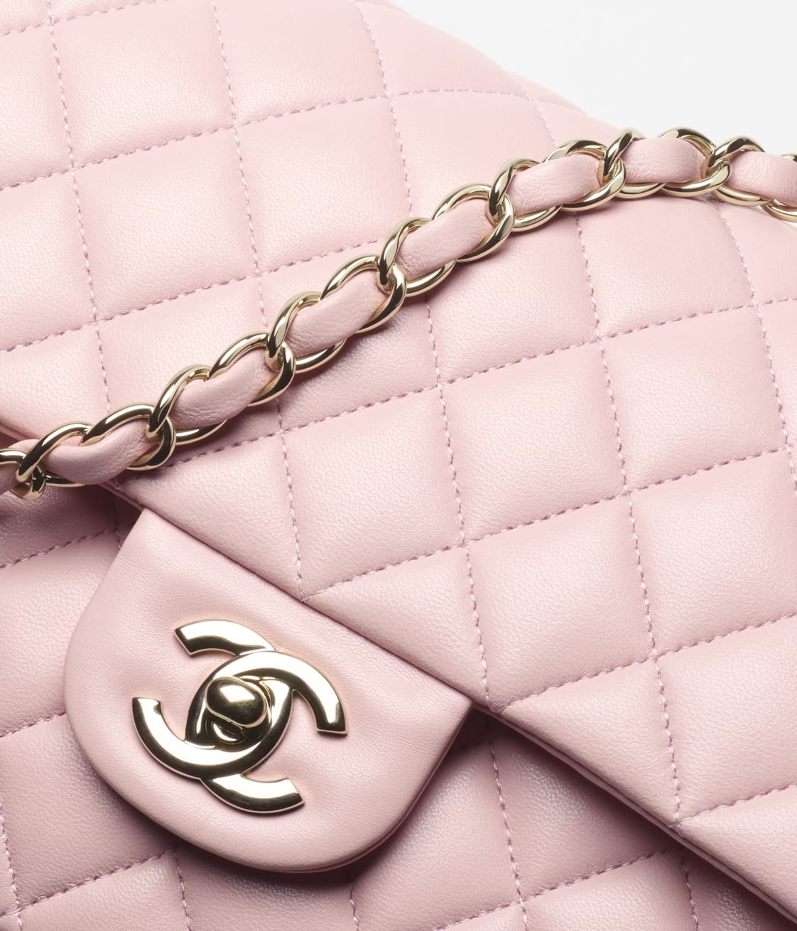 This flap bag is made of light pink lambskin with gold hardware, front flap with signature CC turnlock closure, half-moon back pocket, adjustable gold interwoven chain link and light pink leather shoulder strap.