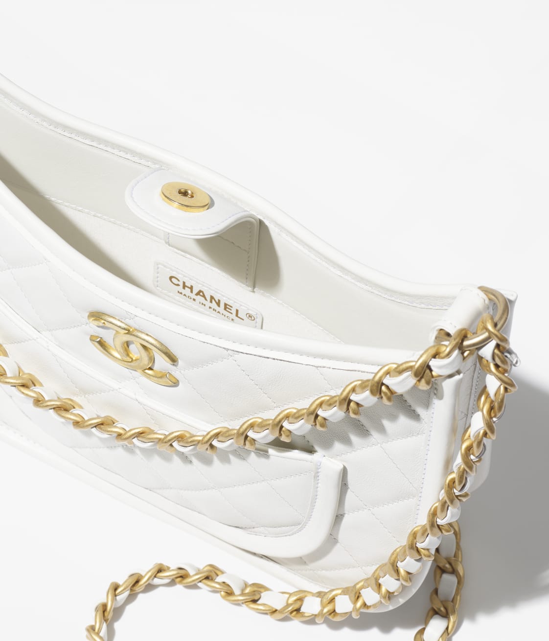 This Chanel HOBO bag is made of white calfskin leather with antique gold hardware, tone-on-tone stitching, front half-moon pocket with CC turnlock closure, antique gold chain and leather shoulder/crossbody strap.