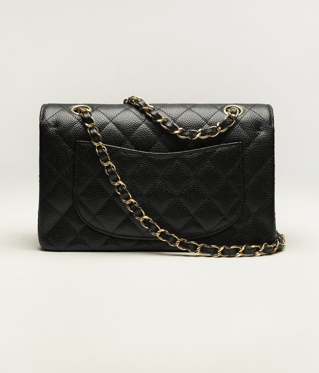 This Small Classic Double Flap bag is in black caviar leather with gold tone hardware and features a front flap with signature CC turnlock closure, half moon back pocket, and adjustable interwoven gold tone chain link and black leather shoulder strap.