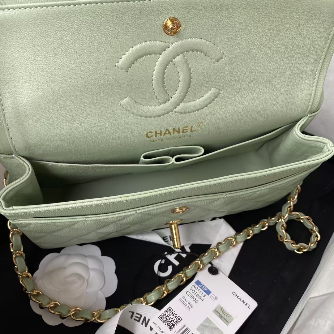 This small Classic Double Flap Bag in Light Green Caviar Leather with Light Gold Hardware features the signature CC turnlock closure on the front flap, half-moon back pocket, adjustable interwoven Light Gold Chain and Light Green Leather Shoulder Strap.