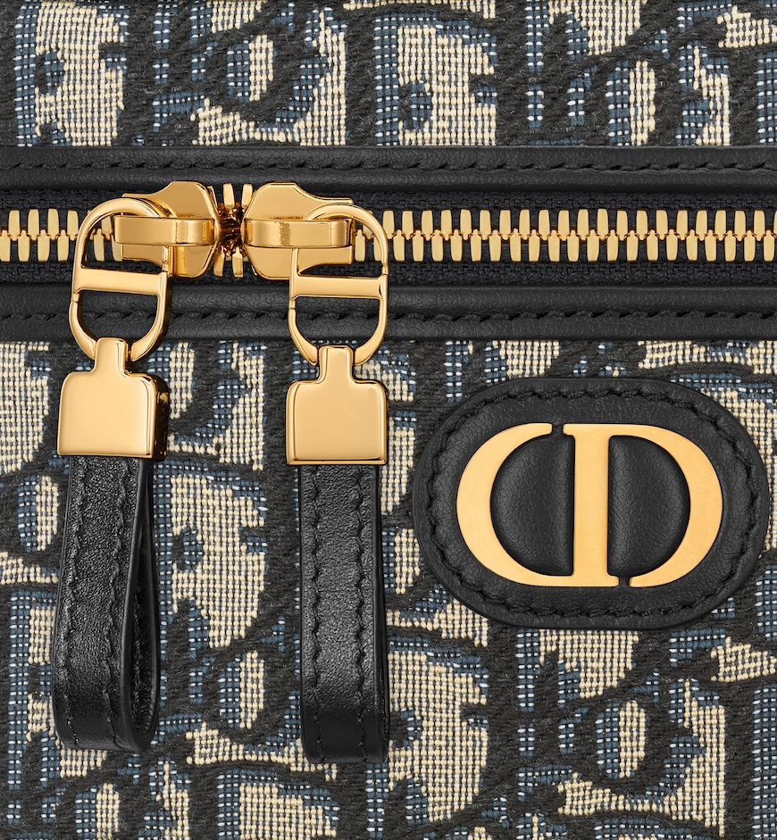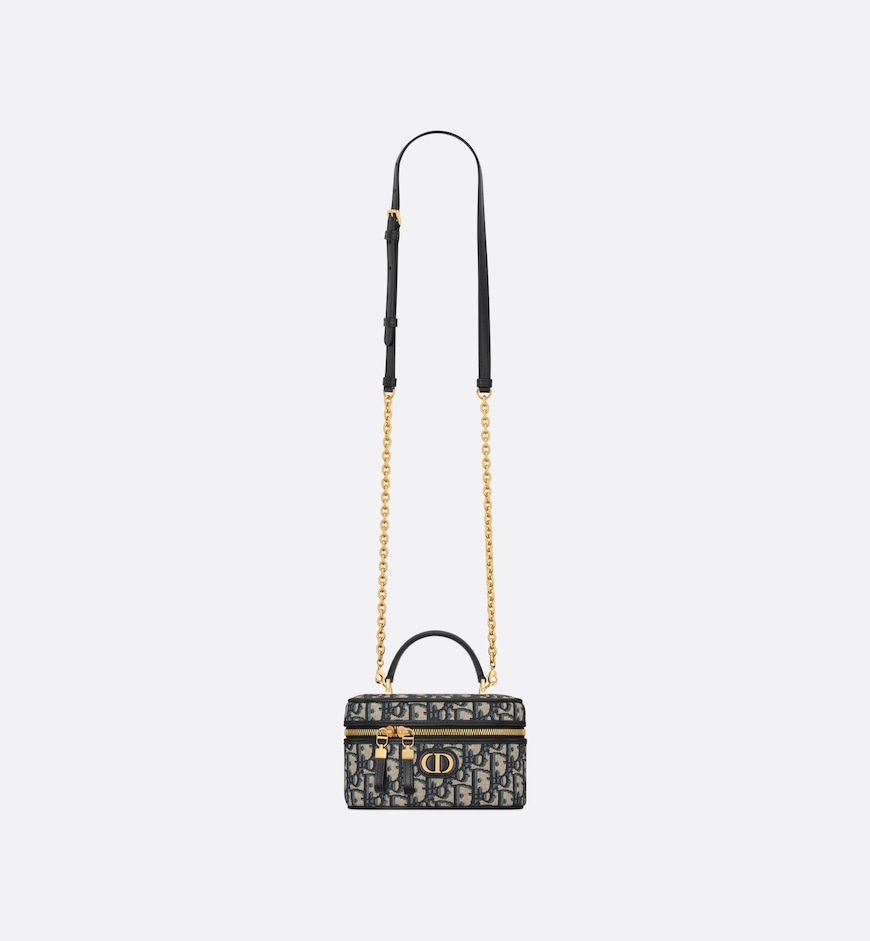 The 30 Montaigne mini vanity case expands the line with a compact design that is both functional and refined. Constructed in blue Dior Oblique jacquard, it is accented by a CD signature on the front. The vanity case will accommodate all the essentials and is completed by an interior pocket and mirror. It can be carried by hand with the handle or worn over the shoulder or crossbody using the adjustable shoulder strap that alternates between gold-finish metal and blue enamel links with a leather insert for added comfort.