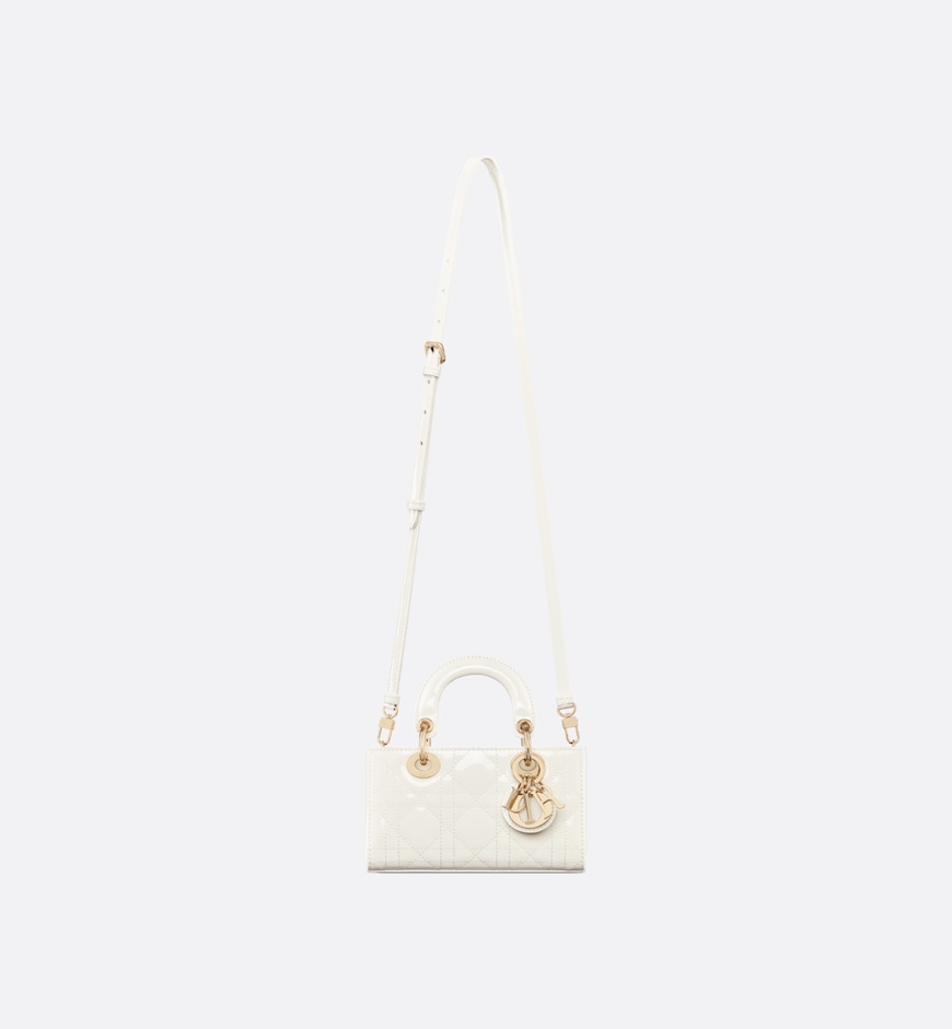 The Lady D-Joy micro bag captures the House’s vision of elegance and beauty by showcasing the iconic streamlined aesthetic of the Lady Dior line. Sleek and refined, the timeless creation is crafted in latte patent calfskin with Cannage topstitching and enhanced by a pale gold-finish metal D.I.O.R. charm. Featuring one removable chain strap and another adjustable and removable leather strap, the Lady D-Joy bag can be carried by hand, worn over the shoulder or crossbody as an ideal day or evening companion.