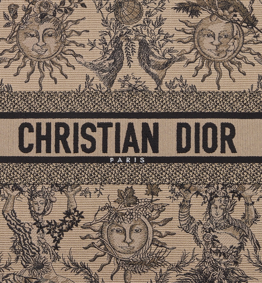 Introduced by Maria Grazia Chiuri, Creative Director of Christian Dior, the Dior Book Tote has become a staple of the Dior aesthetic. Designed to hold all the daily essentials, the style is fully embroidered with the season’s signature Toile de Jouy Soleil motif in beige and black, offering a new take on the iconic House motif with suns and crescent moons layered into a floral design representing the four seasons. Exemplifying House savoir-faire, the large tote is adorned with the Christian Dior Paris signature on the front, and may be carried by hand or worn over the shoulder.