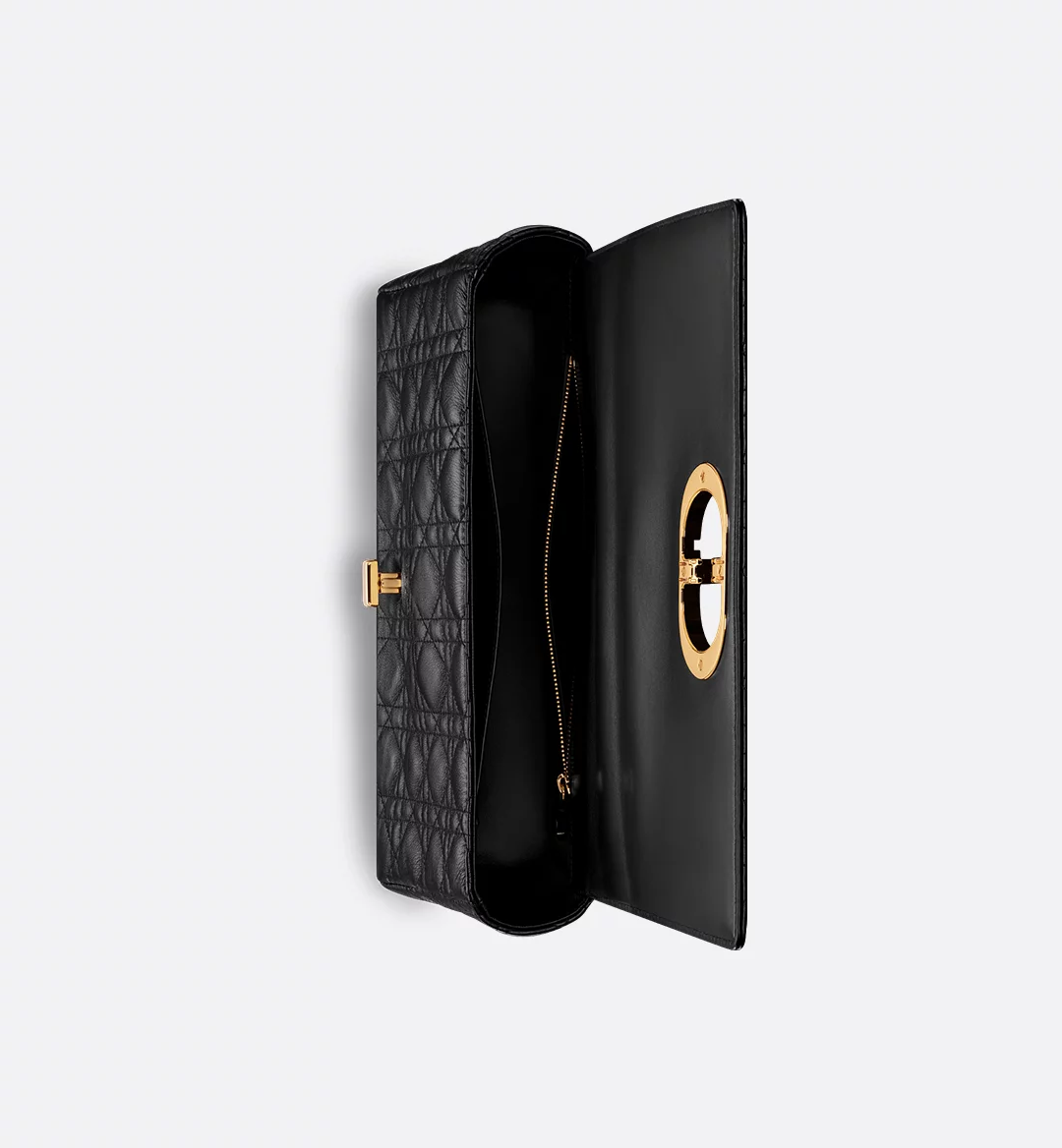 The Dior Caro bag combines modernity with timeless elegance. The silhouette is crafted in black supple calfskin with Cannage stitching. The bag features a flap adorned with an antique gold-finish metal CD twist clasp, inspired by the seal of a Christian Dior perfume bottle. The detachable chain strap with CD signature links allows the large bag to be carried by hand, worn over the shoulder or crossbody, and may be replaced by one of the House’s wide embroidered straps for day or evening attire.
