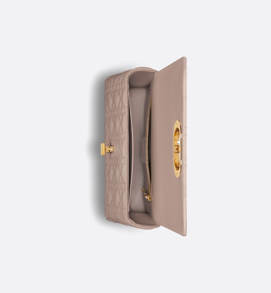 The Dior Caro bag combines modernity with timeless elegance. The silhouette is crafted in warm taupe supple calfskin with Cannage topstitching. The bag features a flap adorned with an antique gold-finish metal CD twist clasp, inspired by the seal of a Christian Dior perfume bottle. The detachable chain shoulder strap with CD signature links allows the medium bag to be carried by hand or worn over the shoulder and may be replaced by one of the House’s wide embroidered straps for day or evening attire.