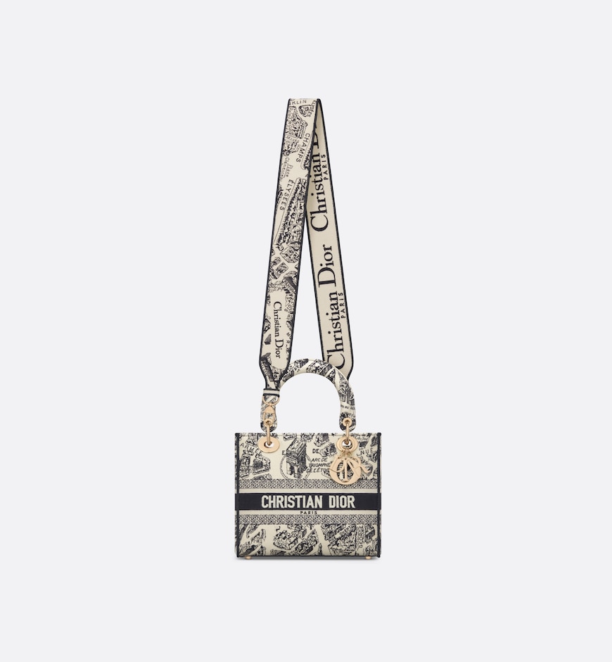 The Lady D-Lite bag combines classic elegance with House modernity. The style is fully embroidered with the beige and navy blue Plan de Paris motif, inspired by House archives and centered around Dior’s historic address on Avenue Montaigne. The front features a Christian Dior Paris signature while the D.I.O.R. charms in pale gold-finish metal embellish and illuminate the silhouette. Equipped with a wide, reversible and removable embroidered shoulder strap, the medium Lady D-Lite bag can be carried by hand or worn crossbody, and can be styled with other Plan de Paris creations.