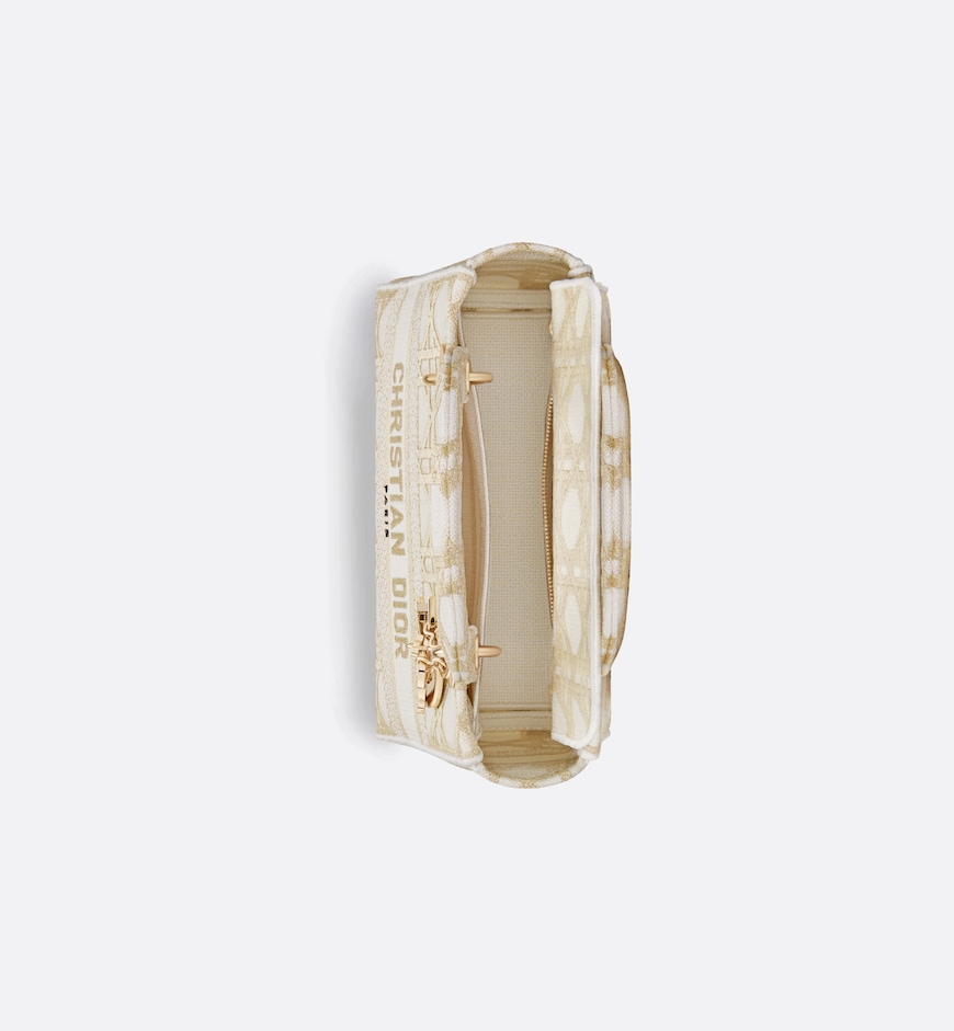 The Lady D-Lite bag combines classic elegance with House modernity. The style is fully embroidered with the white and gold-tone Macrocannage motif. The front features a Christian Dior Paris signature while the D.I.O.R. charms in pale gold-finish metal enhance and illuminate the silhouette. Equipped with a wide, removable embroidered shoulder strap, the medium Lady D-Lite bag can be carried by hand or worn crossbody.
