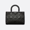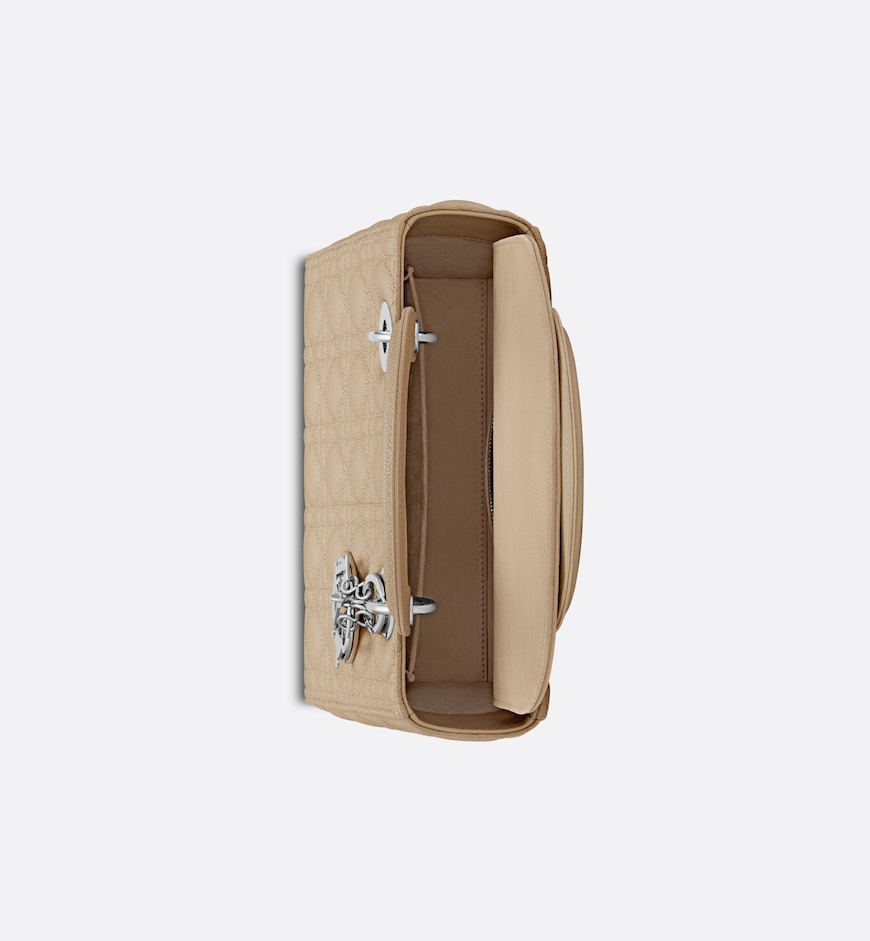 The Lady Dior bag embodies the House’s vision of elegance and beauty. Sleek and refined, the style is timeless. Crafted in sand-colored grained calfskin with Cannage stitching, the bag presents the instantly recognizable quilted texture, while silver-finish metal D.I.O.R. charms offer a modern touch. Featuring a thin, removable leather shoulder strap, the medium Lady Dior bag can be carried by hand or worn crossbody.