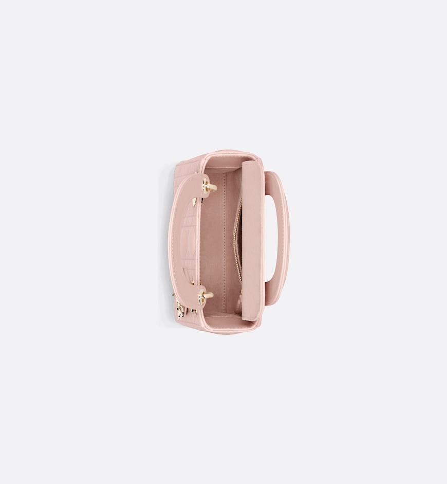 The Lady Dior bag embodies Dior’s vision of elegance and beauty. Sleek and refined, the timeless and modern style is crafted in powder pink lambskin with Cannage stitching, creating the instantly recognizable quilted texture. Pale gold-finish metal D.I.O.R. charms further embellish and highlight its silhouette. Featuring a removable chain shoulder strap, the miniature Lady Dior bag can be carried by hand,