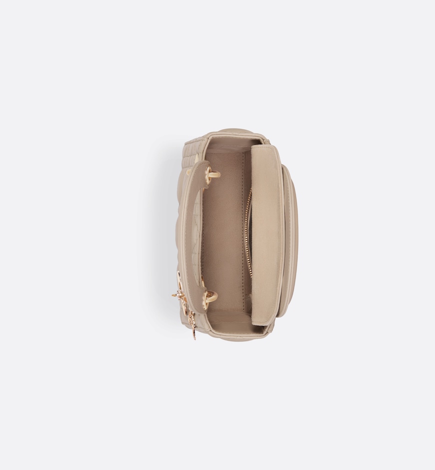 The Lady Dior bag epitomizes the House’s vision of elegance and beauty. Sleek and refined, the style is timeless. It is crafted in powder beige lambskin with Cannage stitching, creating the instantly recognizable quilted texture. The pale gold-finish metal D.I.O.R. charms embellish and illuminate its silhouette. Featuring a removable chain shoulder strap, the miniature Lady Dior bag can be carried by hand or worn