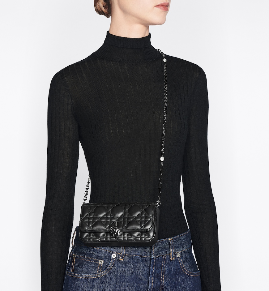 The My Dior – Dior Talk Phone Pouch is a clever and sophisticated creation. Crafted in black Cannage lambskin, it features pale gold-finish metal D.I.O.R. charms. Completed by an elegant removable chain punctuated with resin pearls, the phone pouch can be carried by hand, worn over the shoulder or crossbody.
