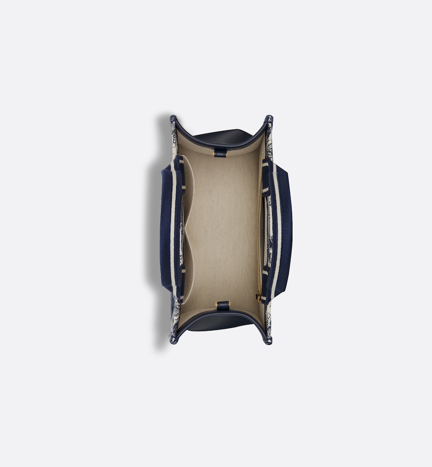 Maria Grazia Chiuri’s hallmark Dior Book Tote offers an original take on elegance. The refined style showcases a fresh interpretation of the House’s iconic motif with the white and navy blue Toile de Jouy Sauvage embroidery and navy blue calfskin. Designed to keep all the daily essentials organized, the interior is equipped with a zip pocket and slip pockets. Featuring an adjustable and removable strap, the practical small tote exemplifies Dior’s savoir-faire and can be carried by hand or worn over the shoulder.