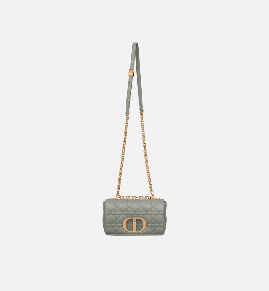 The Dior Caro bag combines modernity with timeless elegance. The silhouette is crafted in stone gray calfskin with Cannage topstitching. The supple bag features a flap adorned with an antique gold-finish metal CD twist clasp, inspired by the seal of a Christian Dior perfume bottle. The detachable chain shoulder strap with CD signature links allows the small bag to be carried by hand or worn over the shoulder and may be replaced by one of the House’s wide embroidered straps for day or evening attire.