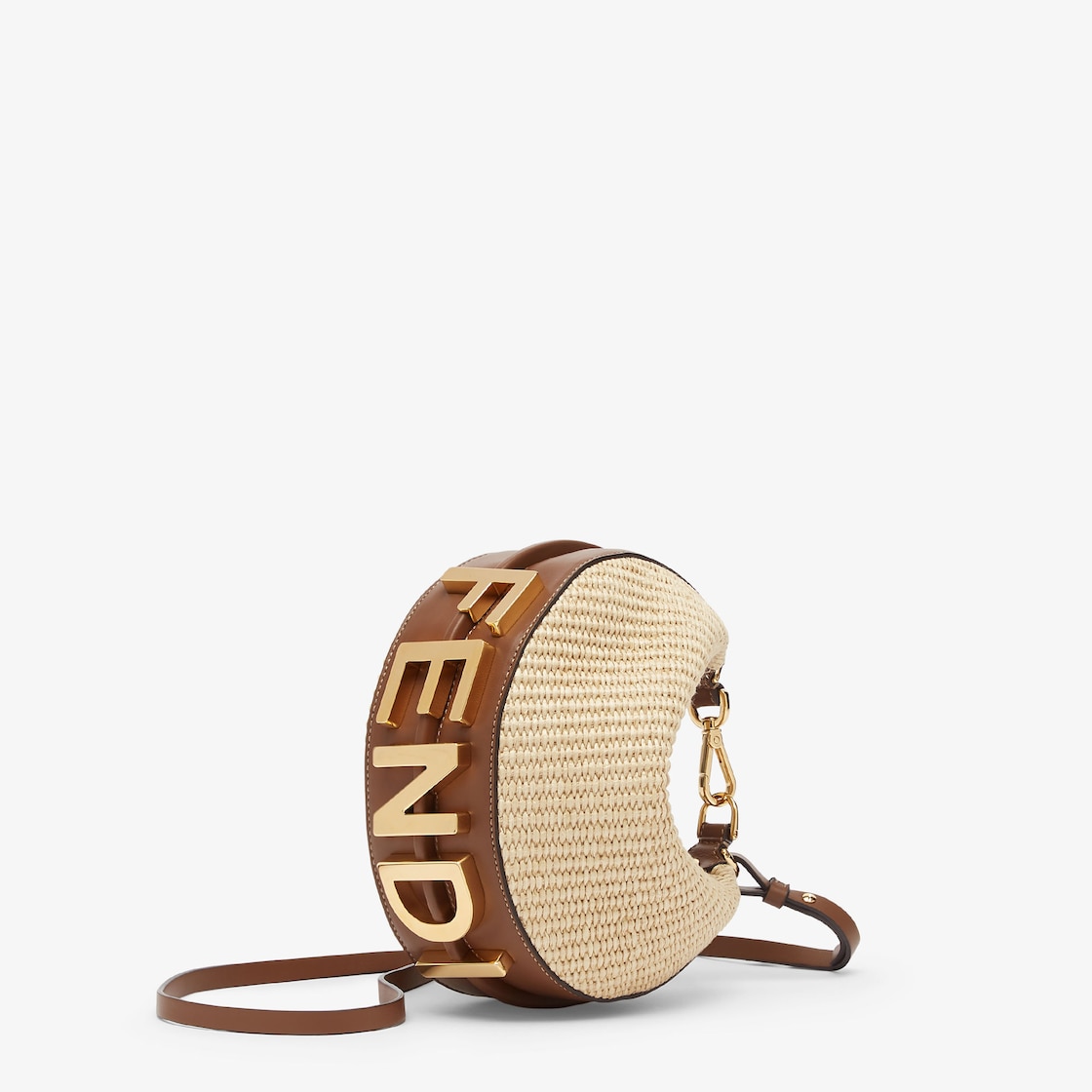 Mini Hobo bag, made of natural-coloured interlaced cotton fibre. Trimmed with brown leather details and embellished with vintage gold metal FENDI lettering.