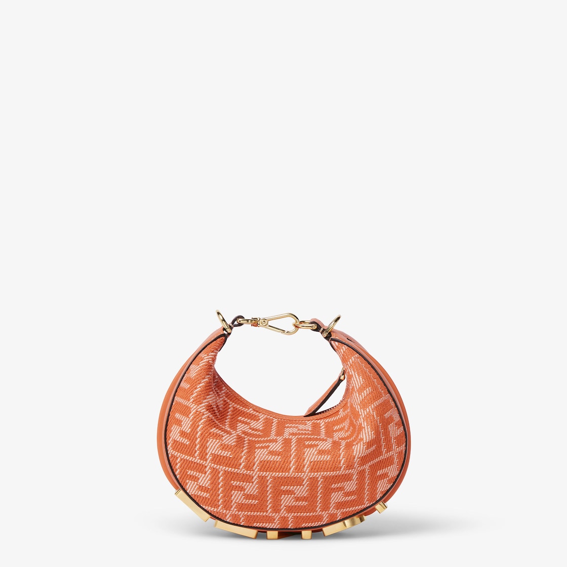 Made of denim-effect FF jacquard in shades of orange, decorated with vintage gold metal FENDI lettering on the base, visible when the bag is worn.