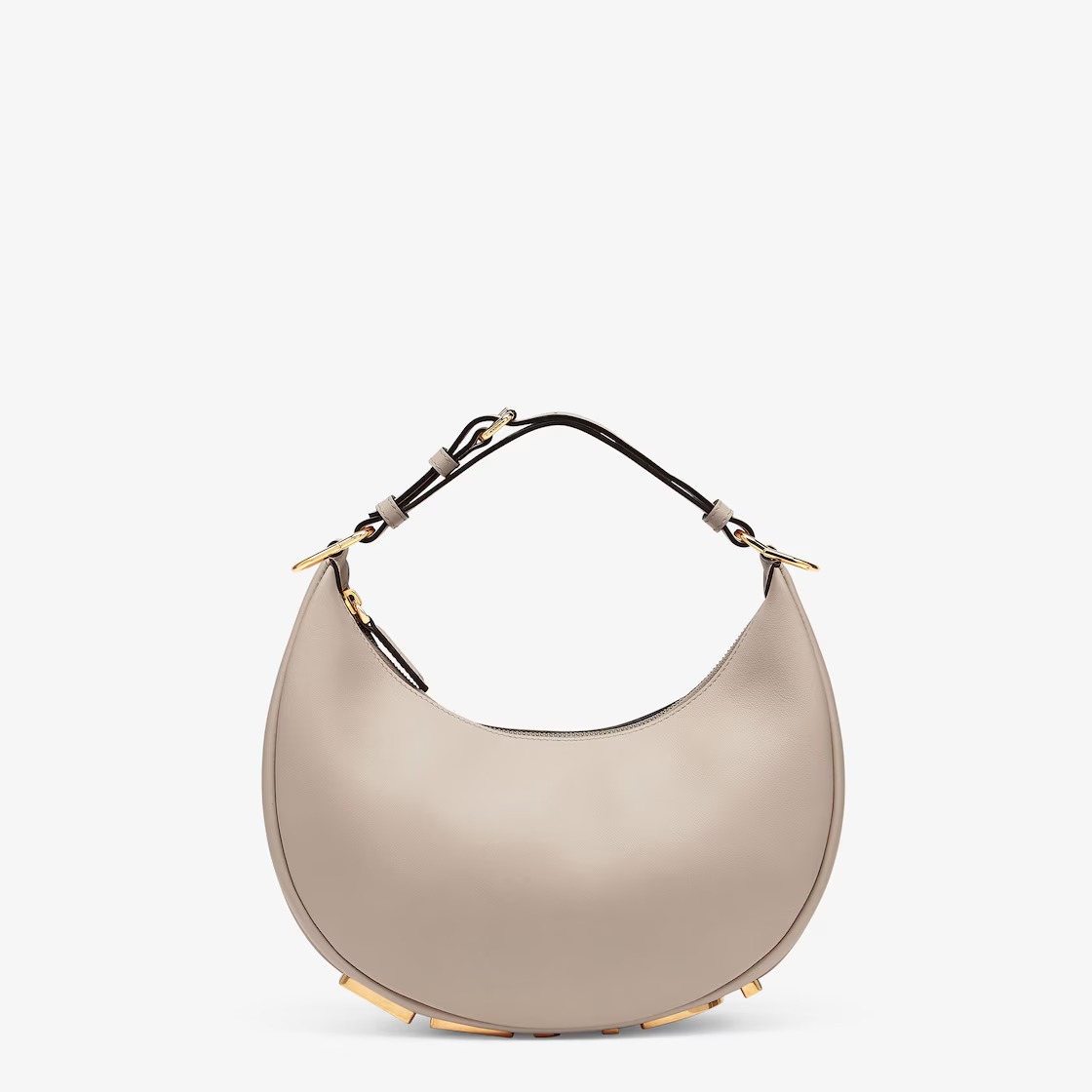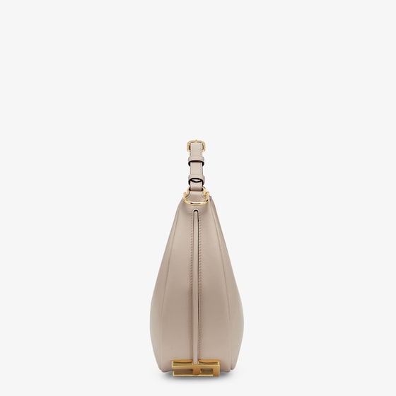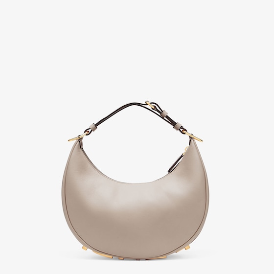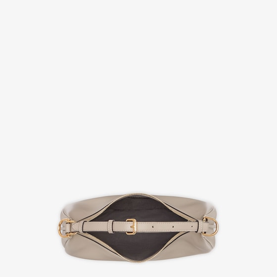 Small hobo bag made of soft, dove gray leather, decorated with vintage gold metal FENDI lettering visible when wearing the bag under the arm.