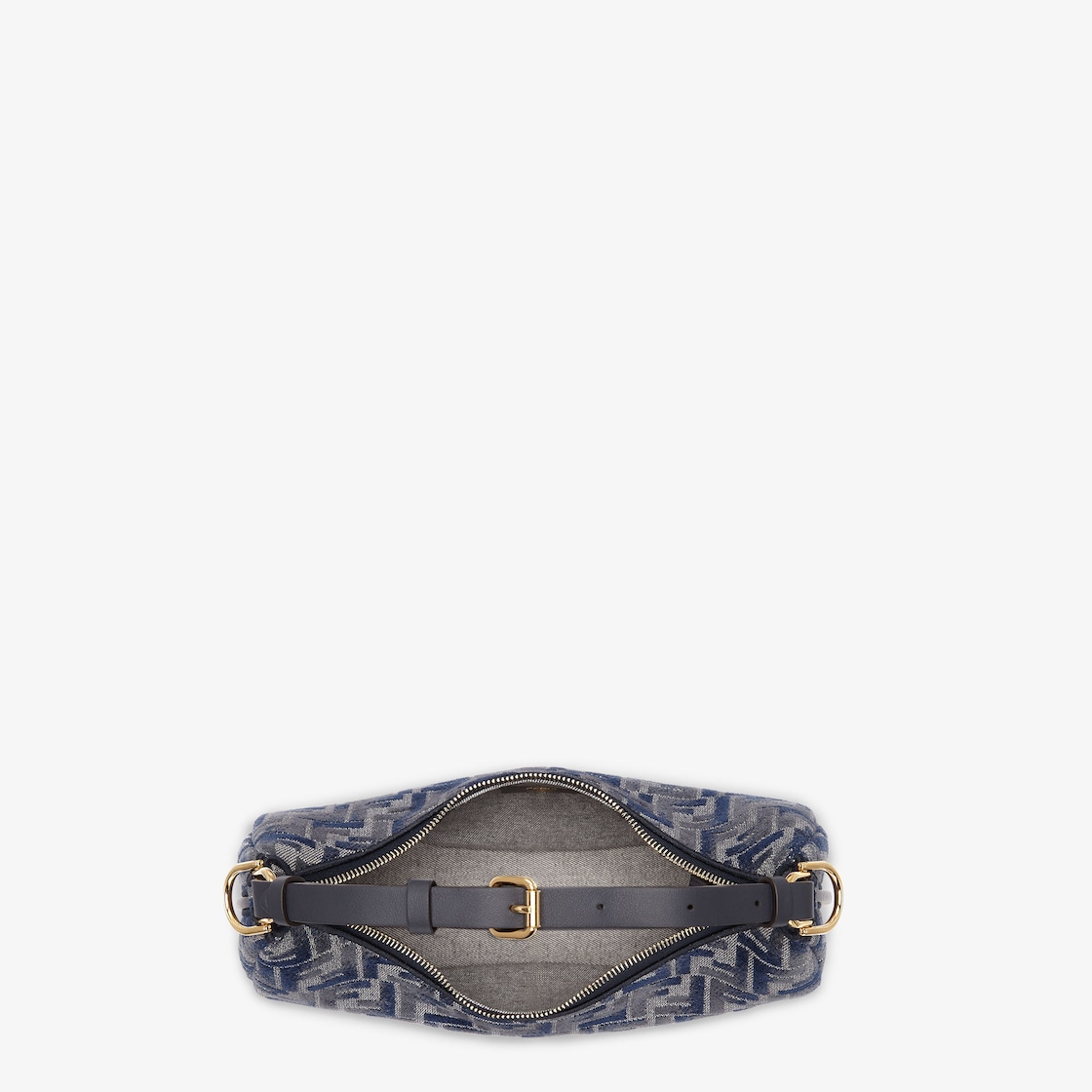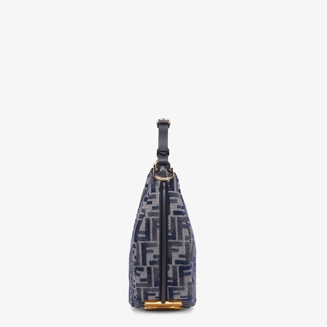Made of chenille with the iconic FF motif in gradient dark blue tones, decorated with vintage gold-finish metal FENDI lettering on the base, visible when wearing the bag under the arm.