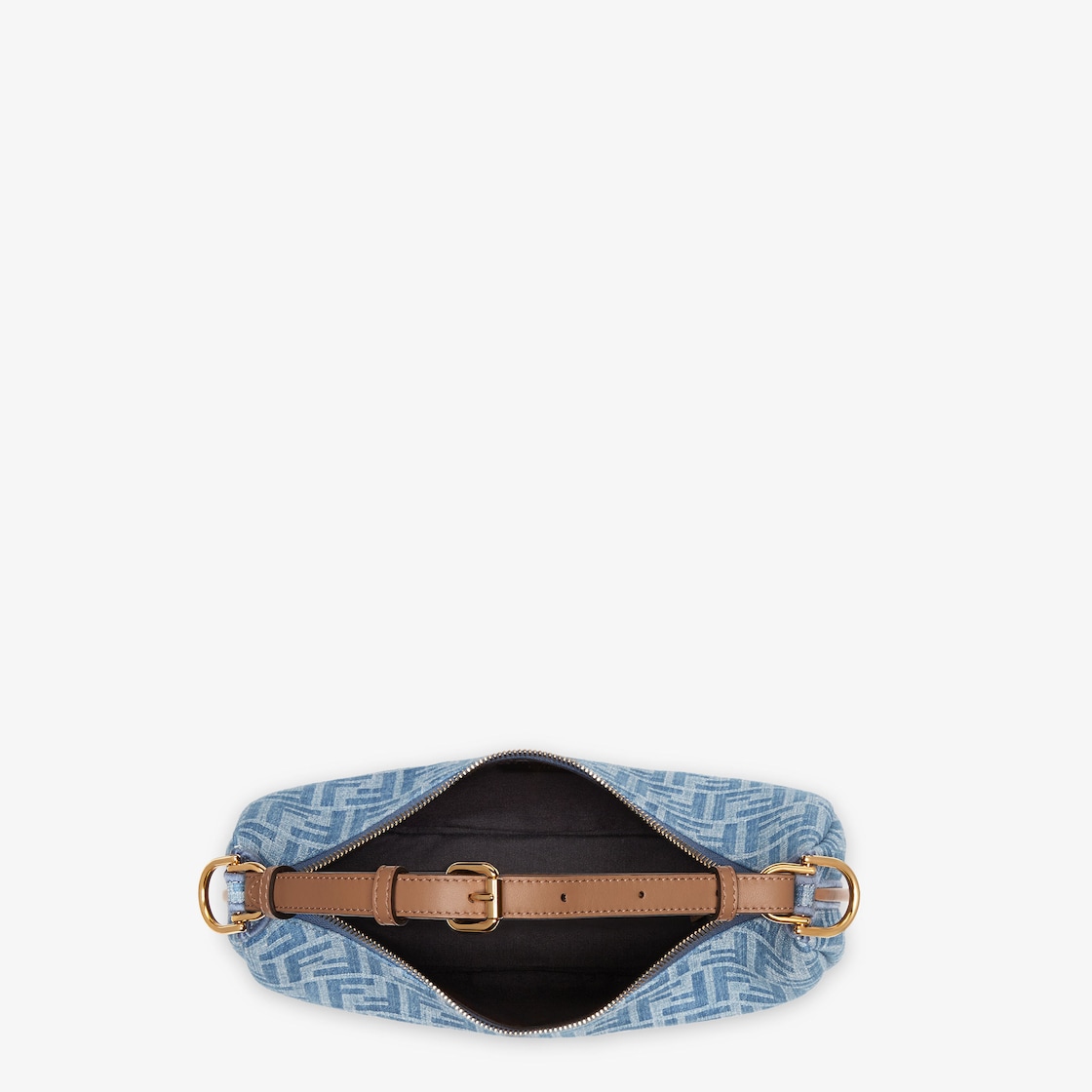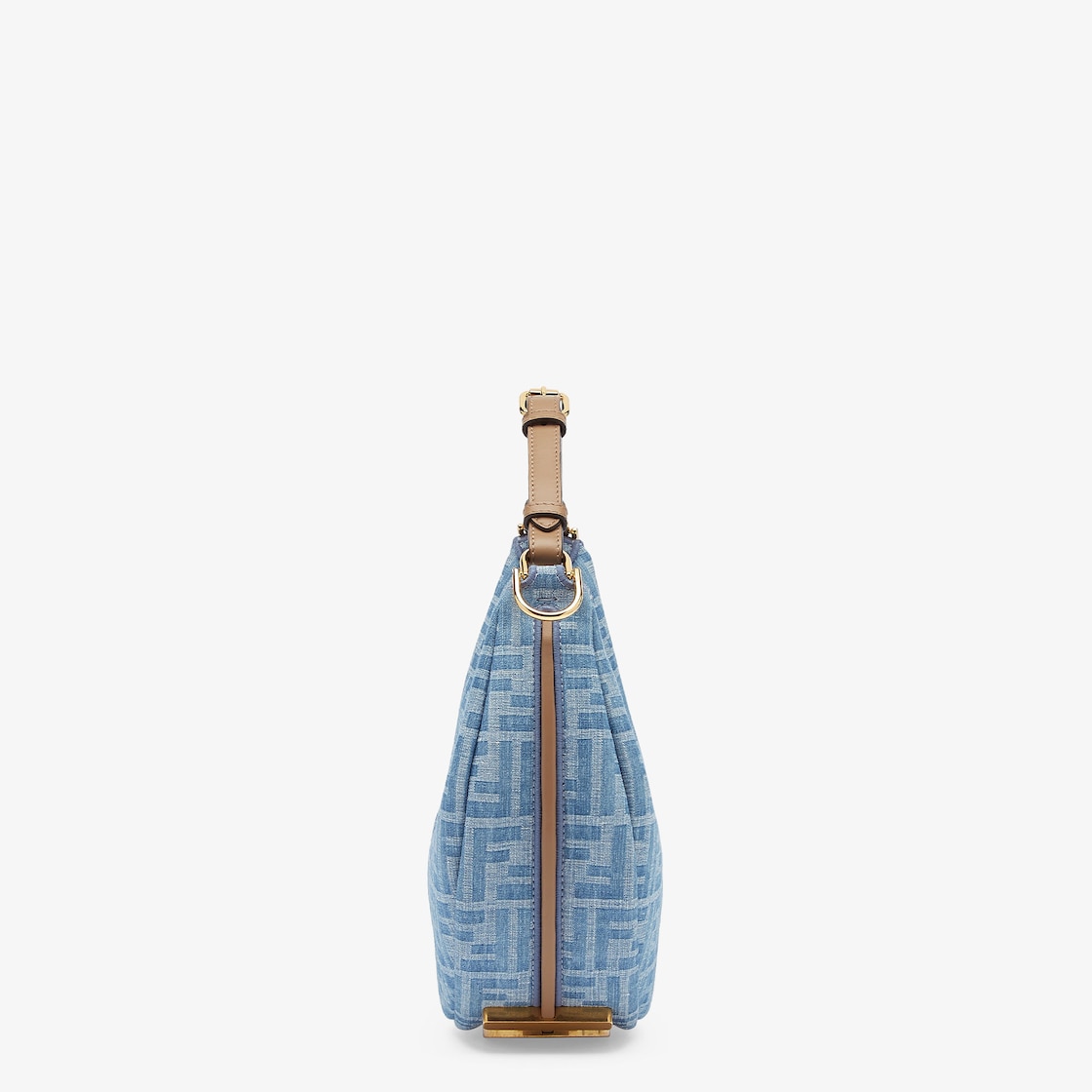 Made of light blue denim fabric with an FF motif, trimmed with beige calfskin and embellished with vintage gold metal FENDI lettering at the bottom, visible when wearing the bag under the arm.