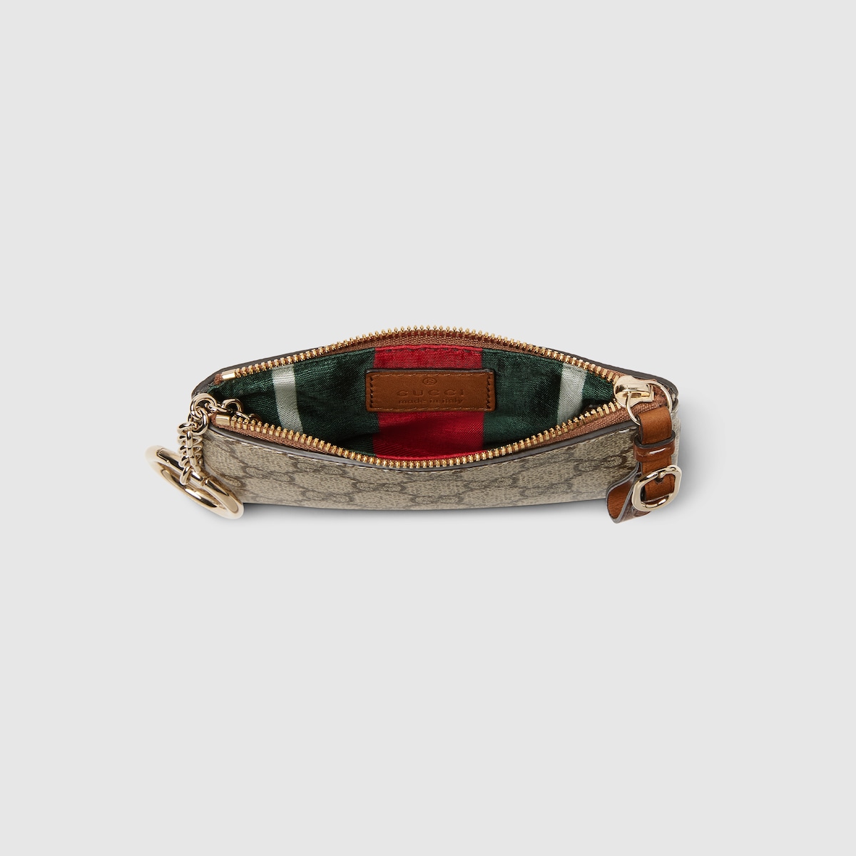 The GG Emblem collection reinterprets signature motifs through creativity and innovative functions , and is envisioned to be cherished for years to come. Introduced in the latest line of small accessories, this beige and dark brown key case is crafted from the new GG Monogram fabric. Featuring a zip closure with a leather puller, the inside features a keychain hook.