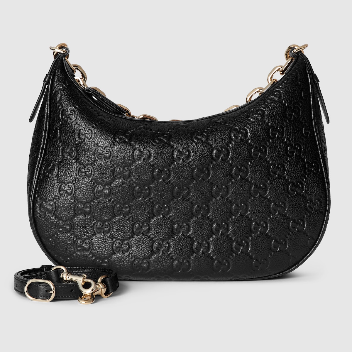 The new GG Emblem collection reinterprets the House??s history of elegance and craftsmanship. This medium shoulder bag is crafted from GG grainy leather and comes with a chain strap.