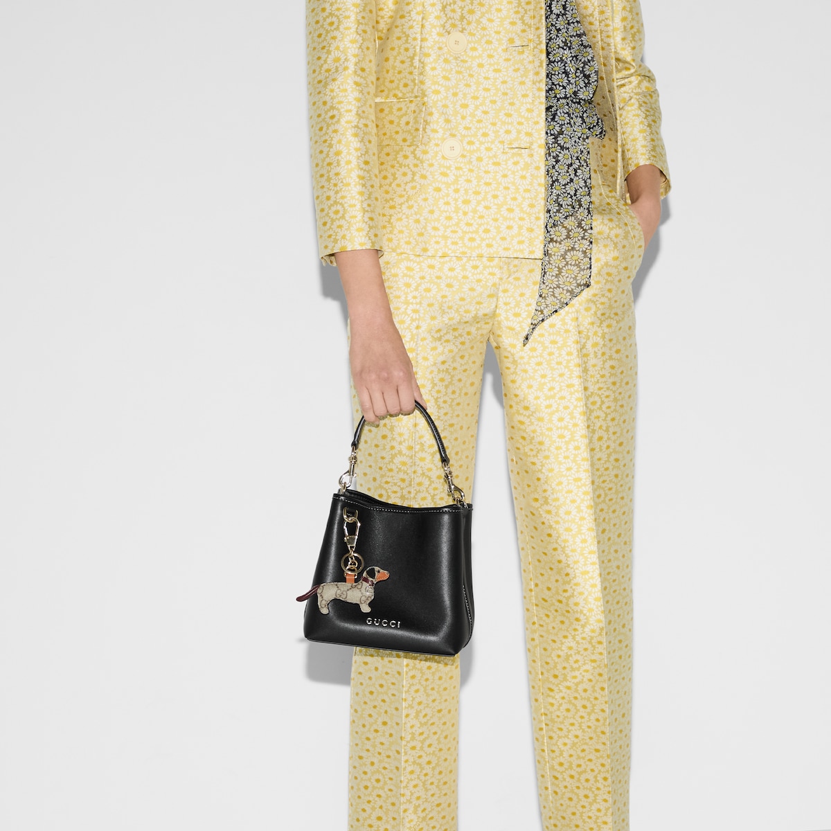 The new GG Emblem collection reinterprets the House??s history of elegance and craftsmanship. This mini bucket bag highlights functional design with an interior compartment.