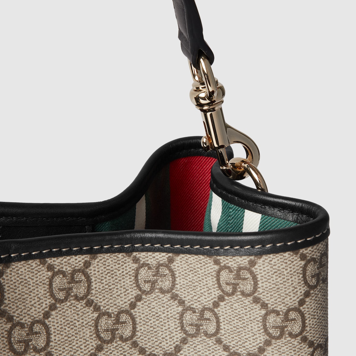The new GG Emblem collection reinterprets the House??s history of elegance and craftsmanship. This mini bucket bag highlights functional design with an interior compartment.