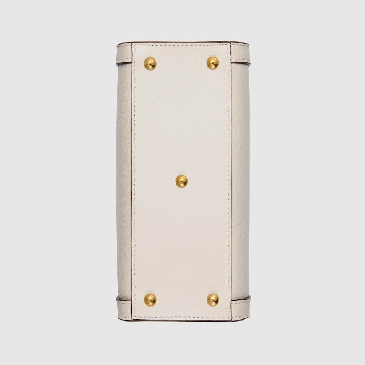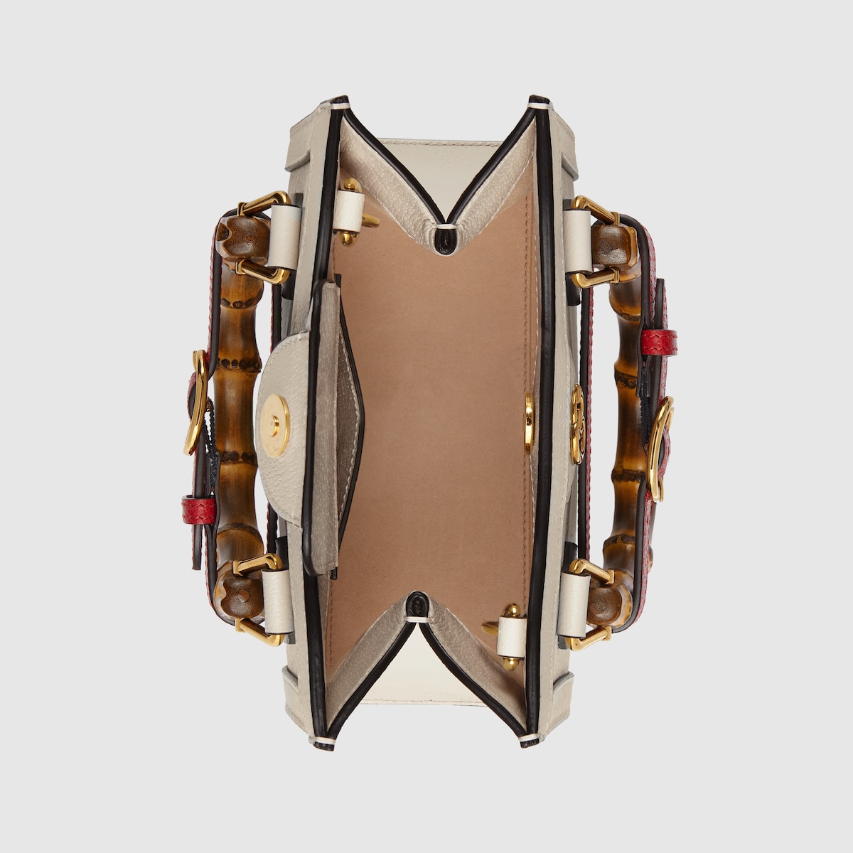 An evolution of a bamboo handle tote first introduced in 1991, the Gucci Diana represents the notion of style in constant evolution and is reimagined with removable, neon leather belts??a nod to the functional bands used to keep the handles in shape. Here, a mini version of the emblematic style is presented in white leather.