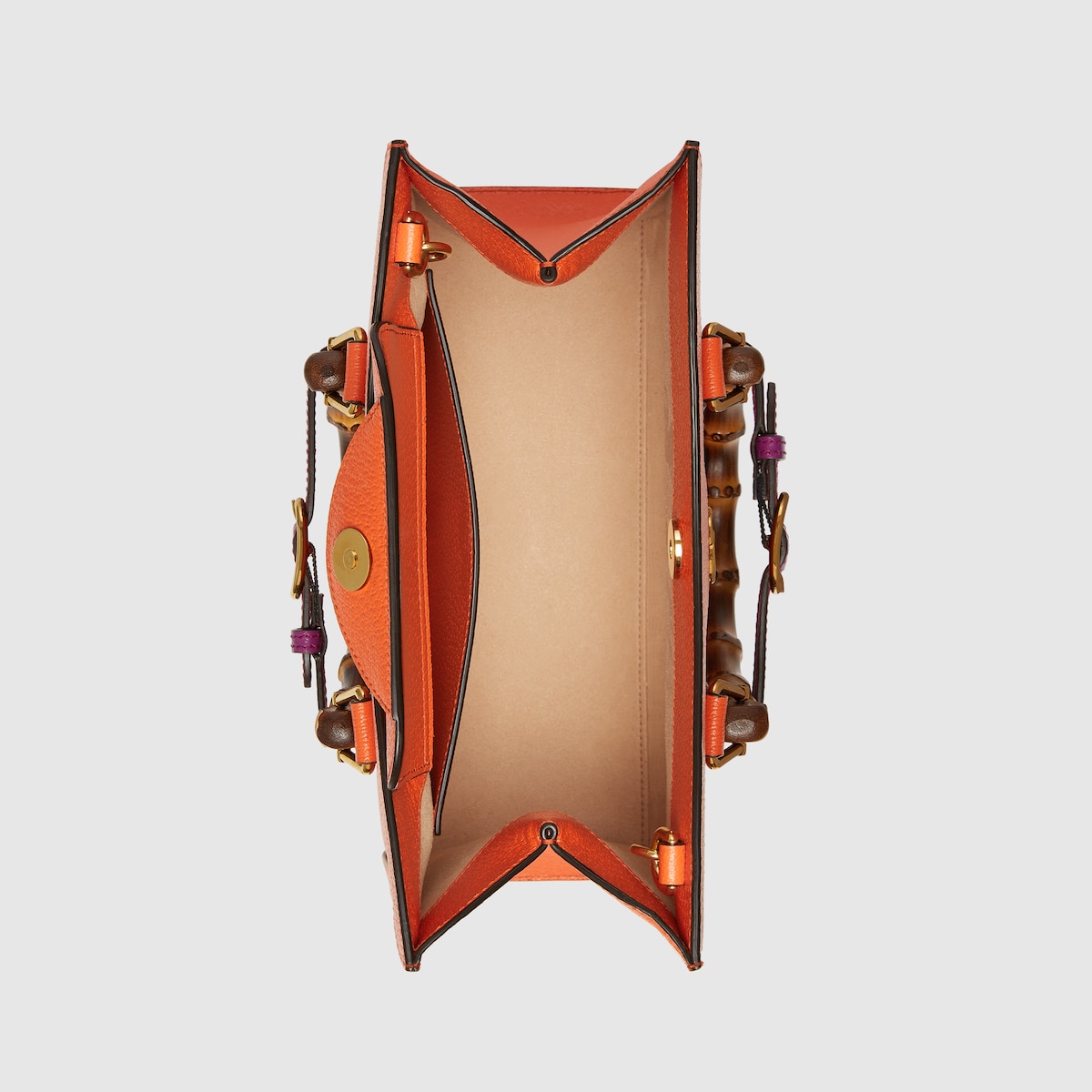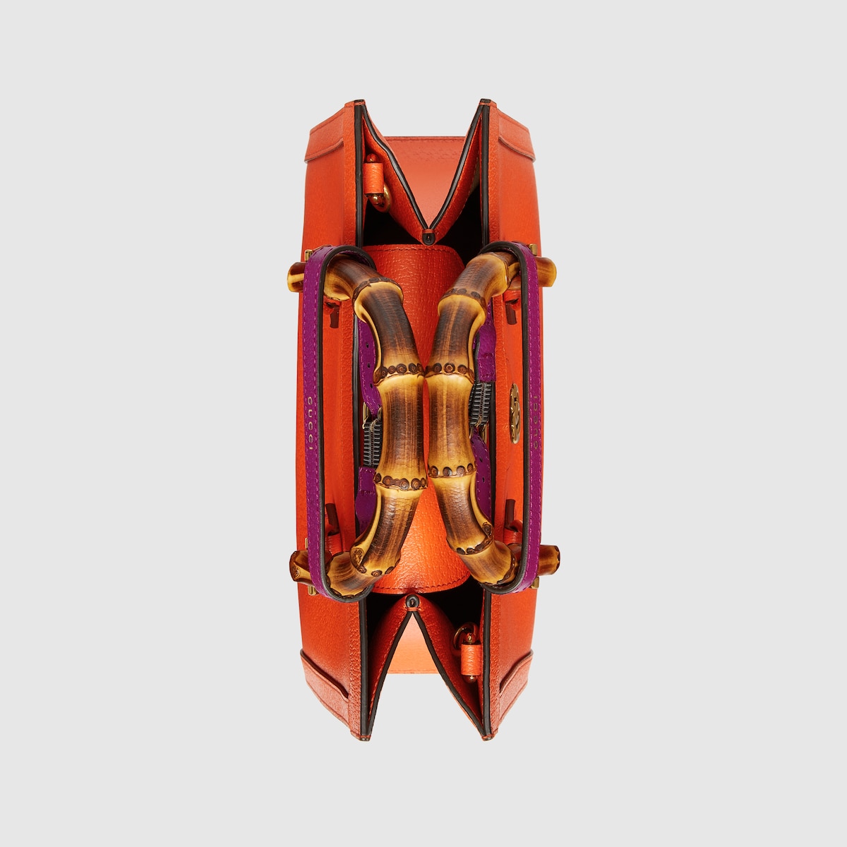 Combining recognizable elements of the House, the Gucci Diana is defined by its bamboo handles and Double G hardware. Crafted from orange leather, the small-sized tote bag is further accentuated by two colored bands, a playful reference to the bands used to keep handles in shape.