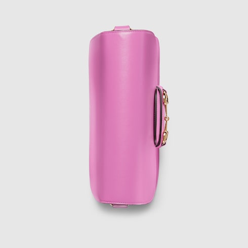 Presenting new vibrant colors which highlight sophisticated leather, the Gucci 1955 Horsebit evolves as part of the latest collection with light gold-toned hardware, signature versatility and functionality. This small shoulder bag with adjustable shoulder strap is crafted in pink leather to welcome the upcoming season.