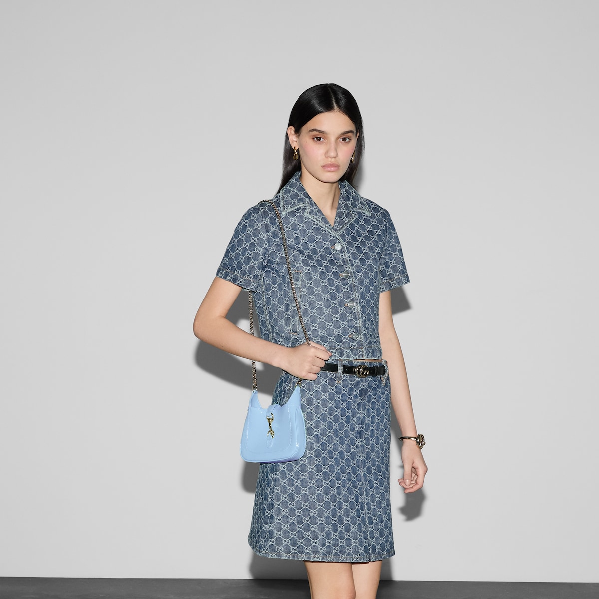 Inspired by the summer spirit and beach clubs on the Italian coast, this item is part of Gucci Lido. The Jackie Notte embodies the self-confidence of the iconic Jackie line, with a new silhouette and subtle details that make it perfect for day to night wear. Sky blue patent leather, a hook closure, and light gold-toned Gucci lettering chain strap give this mini shoulder bag a unique touch.